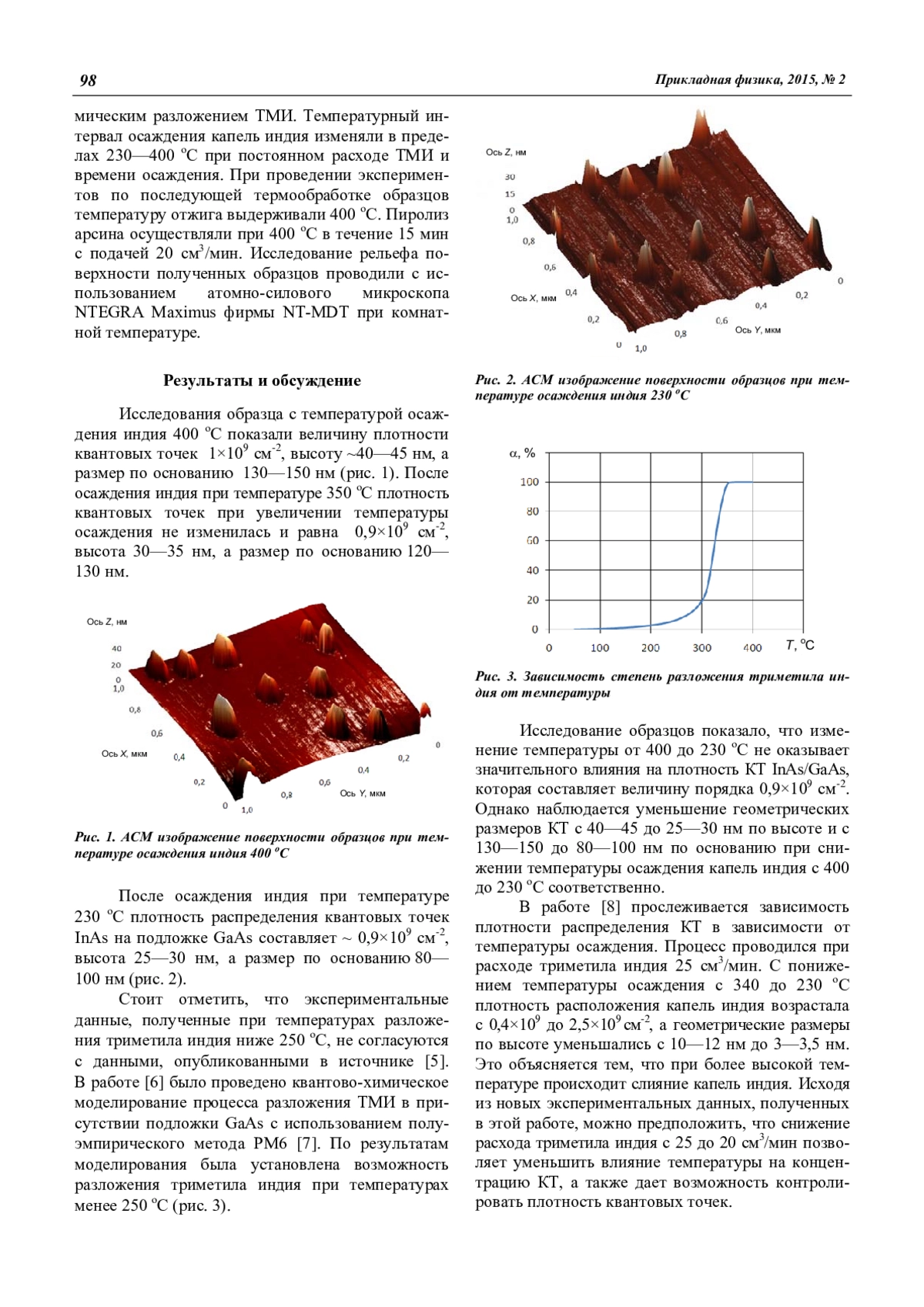 Исследовано влияние температуры разложения триметила индия на геометрию и морфологию массива квантовых точек InAs, выращиваемых капельным методом на поверхности подложки GaAs в условиях МОС-гидридной эпитаксии. Подтверждены теоретические расчеты по степени разложения триметила индия при температуре ниже 300 оС.