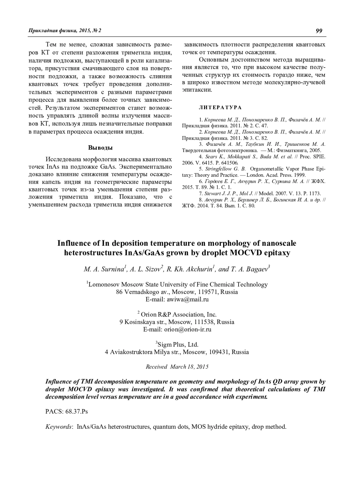 M. A. Surnina, A. L. Sizov, R. H. Akchurin, I. V. Yarodskaya, and T. A. Bagaev Influence of In deposition temperature on mor-phology of nanoscale heterostructures InAs/GaAs grown by droplet MOCVD epitaxy 97