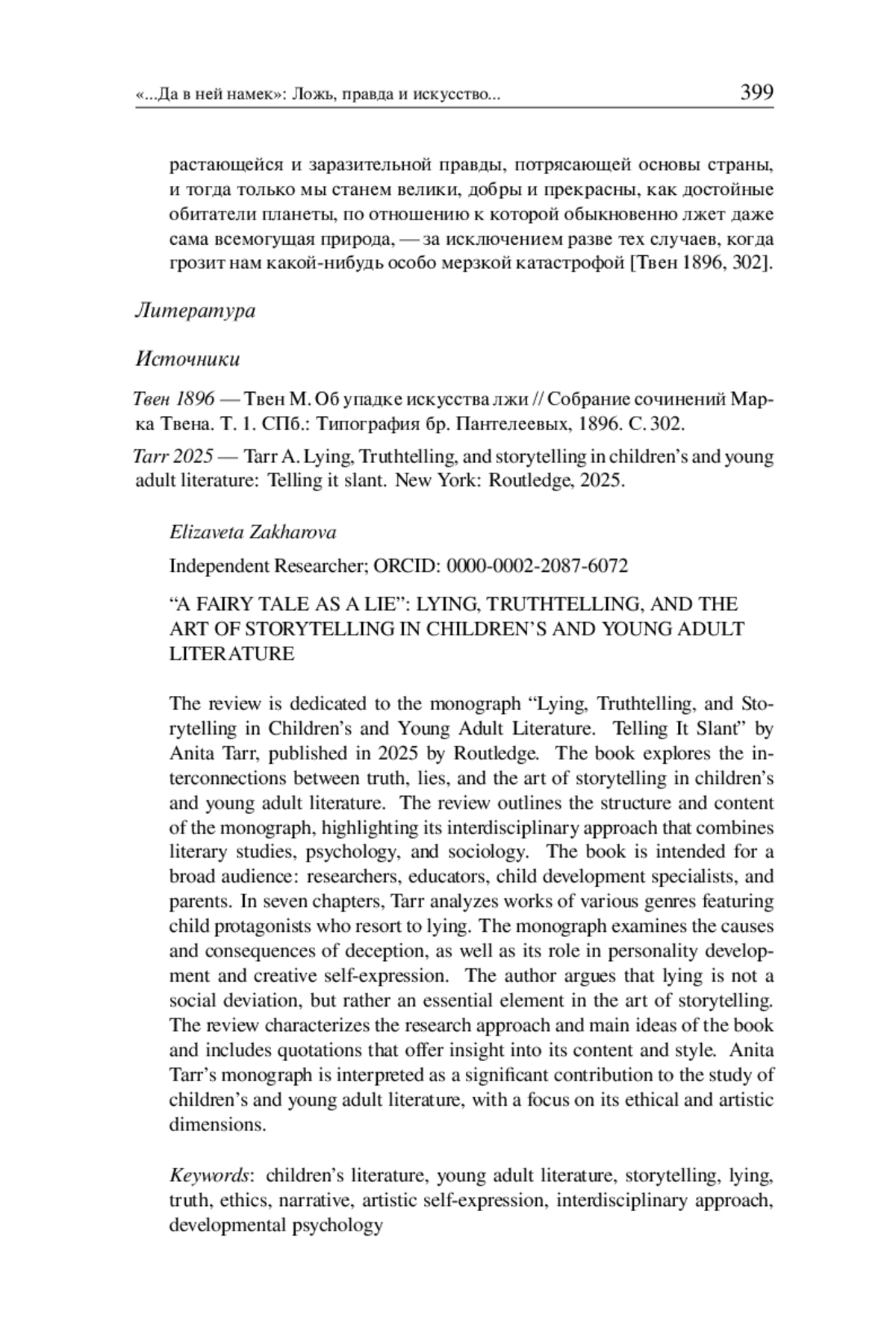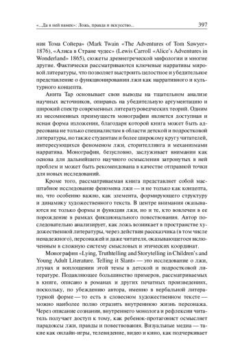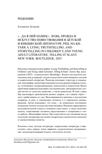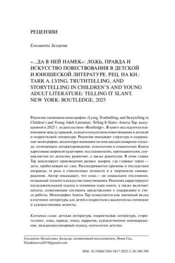The review is dedicated to the monograph “Lying, Truthtelling, and Storytelling in Children’s and Young Adult Literature. Telling It Slant” by Anita Tarr, published in 2025 by Routledge. The book explores the interconnections between truth, lies, and the art of storytelling in children’s and young adult literature. The review outlines the structure and content of the monograph, highlighting its interdisciplinary approach that combines literary studies, psychology, and sociology. The book is intended for a broad audience: researchers, educators, child development specialists, and parents. In seven chapters, Tarr analyzes works of various genres featuring child protagonists who resort to lying. The monograph examines the causes and consequences of deception, as well as its role in personality development and creative self-expression. The author argues that lying is not a social deviation, but rather an essential element in the art of storytelling. The review characterizes the research approach and main ideas of the book and includes quotations that offer insight into its content and style. Anita Tarr’s monograph is interpreted as a significant contribution to the study of children’s and young adult literature, with a focus on its ethical and artistic dimensions.