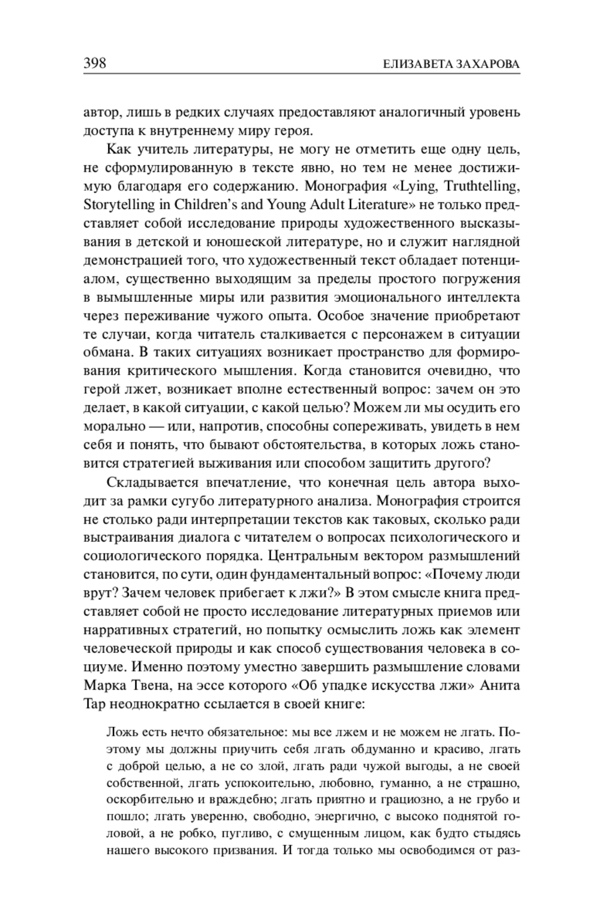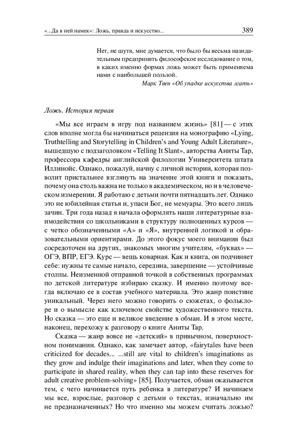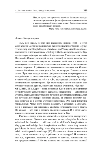 «Мы все играем в игру под названием жизнь» [81] — с этих слов вполне могла бы начинаться рецензия на монографию «Lying, Truthtelling and Storytelling in Children’s and Young Adult Literature», вышедшую с подзаголовком «Telling It Slant», авторства Аниты Тар, профессора кафедры английской филологии Университета штата Иллинойс. Однако, пожалуй, начну с личной истории, которая позволит пристальнее взглянуть на значение этой книги и показать, почему она столь важна не только в академическом, но и в человеческом измерении. Я работаю с детьми почти пятнадцать лет. Однако это не юбилейная статья и, упаси Бог, не мемуары. Это всего лишь зачин. Три года назад я начала оформлять наши литературные взаимодействия со школьниками в структуру полноценных курсов — с четко обозначенными «А» и «Я», внутренней логикой и образовательными ориентирами. До этого фокус моего внимания был сосредоточен на других, знакомых многим учителям, «буквах» — ОГЭ, ВПР, ЕГЭ. Курс — вещь коварная. Как и книга, он подчиняет себе: нужны те самые начало, середина, завершение — устойчивые столпы. Неизменной отправной точкой в собственных программах по детской литературе избираю сказку. И именно поэтому всегда включаю ее в состав учебного материала. Это жанр поистине уникальный. Через него можно говорить о сюжетах, о фольклоре и о вымысле как ключевом свойстве художественного текста. Но сказка — это еще и великое введение в обман. И в этом месте, наконец, перехожу к разговору о книге Аниты Тар.
