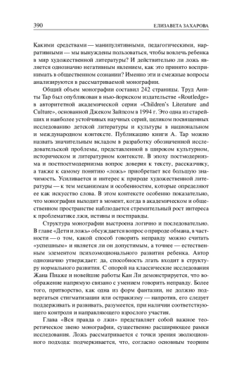 Рецензия посвящена монографии «Lying, Truthtelling, and Storytelling in Children’s and Young Adult Literature. Telling It Slant» Аниты Тар, выпущенной в 2025 г. издательством «Routledge». В книге исследуются взаимосвязи между правдой, ложью и искусством повествования в детской и подростковой литературе. Рецензия описывает структуру и содержание монографии, акцентируя внимание на междисциплинарном подходе, сочетающем литературоведение, психологию и социологию. Книга адресована широкой аудитории: исследователям, преподавателям, специалистам по детскому развитию, а также родителям. В семи главах Тар анализирует произведения разных жанров, где главные герои — дети, прибегающие ко лжи. Рассматриваются причины и последствия неправды, еt роль в становлении личности и в творческом самовыражении. Автор показывает, что ложь — не социальное отклонение, но важный элемент в искусстве повествования. Рецензия характеризует исследовательский подход и основные идеи книги, а также включает цитаты, позволяющие составить представление о содержании и стиле работы. Монография Аниты Тар осмысляется как значимый вклад в изучение литературы для детей и подростков с акцентом на этические и художественные аспекты.