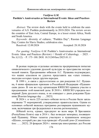 Васильева Г.М. Пушкинские юбилеи как международные события: идеи и практики (Обзор) // Вестник культурологии. – 2025. – No 1(112). – С. 175–188. – DOI: 10.31249/hoc/2025.01.11