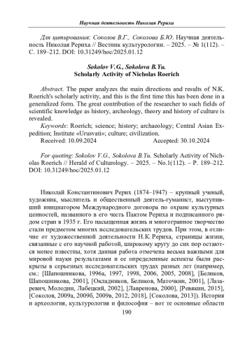 Соколов В.Г., Соколова Б.Ю. Научная деятельность Николая Рериха // Вестник культурологии. – 2025. – No 1(112). – С. 189–212. DOI: 10.31249/hoc/2025.01.12