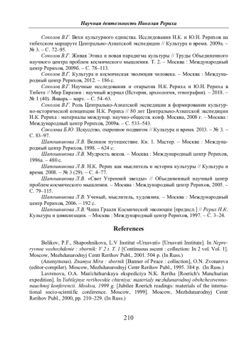 19. Соколов В.Г. Роль Центрально-Азиатской экспедиции в формировании культурно-исторической концепции Н.К. Рериха // 80 лет Центрально-Азиатской экспедиции Н.К. Рериха: материалы междунар. научно-обществ. конф. Москва, 2008 г. - Москва: Международный центр Рерихов, 2009в. - С. 533-543. EDN: JXYYZN