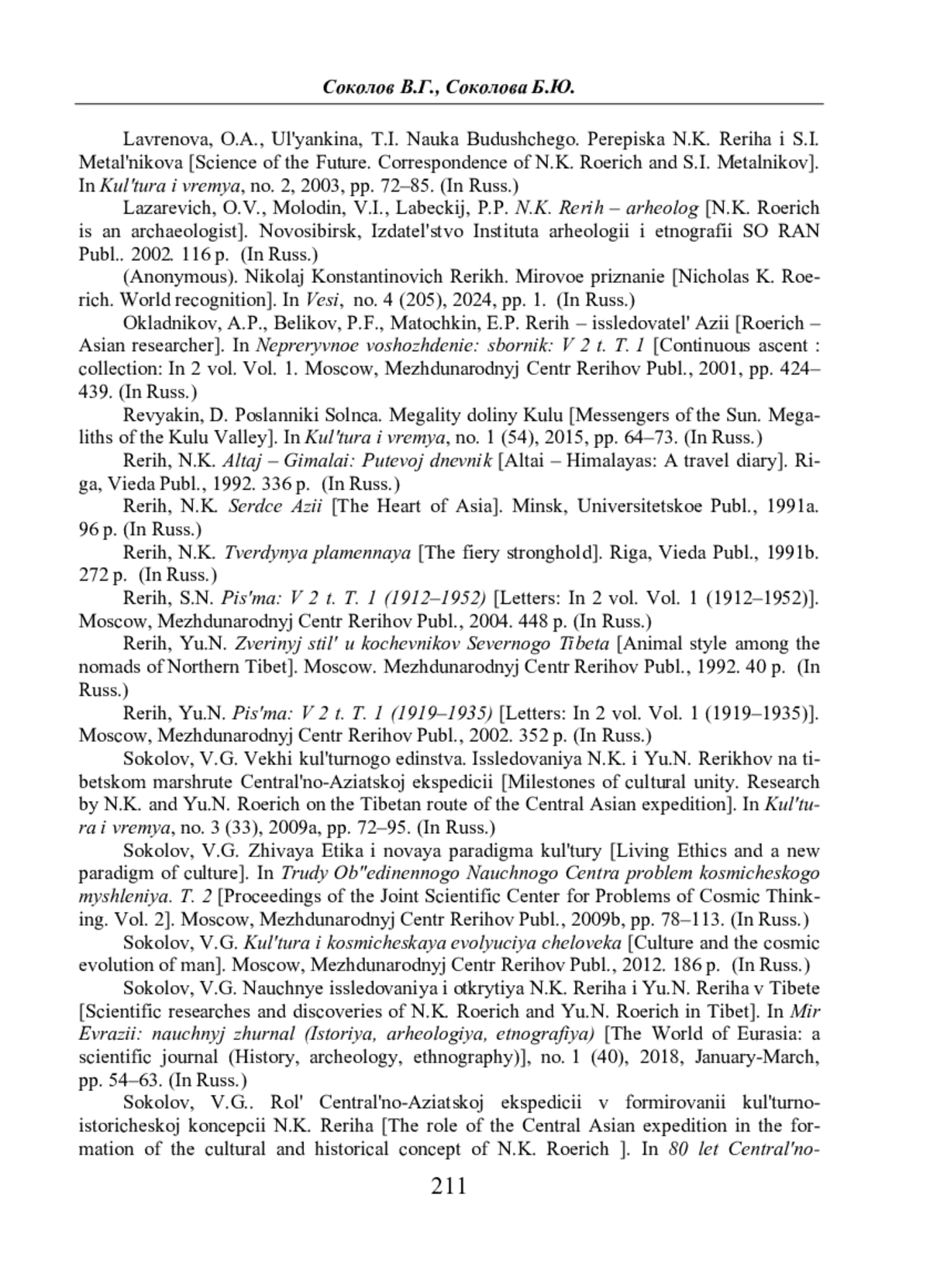 15. Sokolov, V.G. Vekhi kul’turnogo edinstva. Issledovaniya N.K. i Yu.N. Rerikhov na tibetskom marshrute Central’no‑Aziatskoj ekspedicii [Milestones of cultural unity. Research by N.K. and Yu.N. Roerich on the Tibetan route of the Central Asian expedition]. In Kul’tura i vremya, no. 3 (33), 2009a, pp. 72–95. (In Russ.)