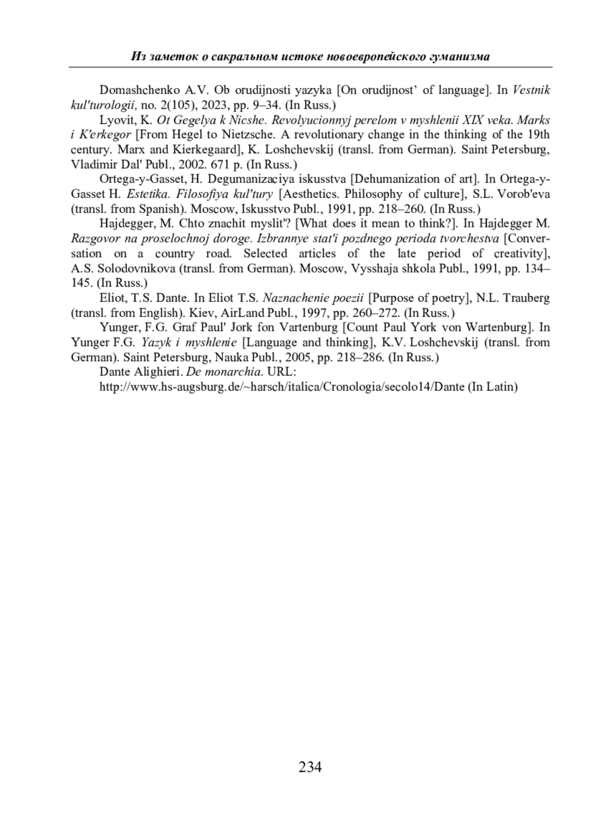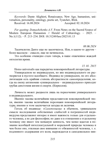 Домащенко А.В. Из заметок о сакральном истоке новоевропейского гуманизма // Вестник культурологии. – 2025. – No 1(112). – С. 213–234. – DOI: 10.31249/hoc/2025.01.13