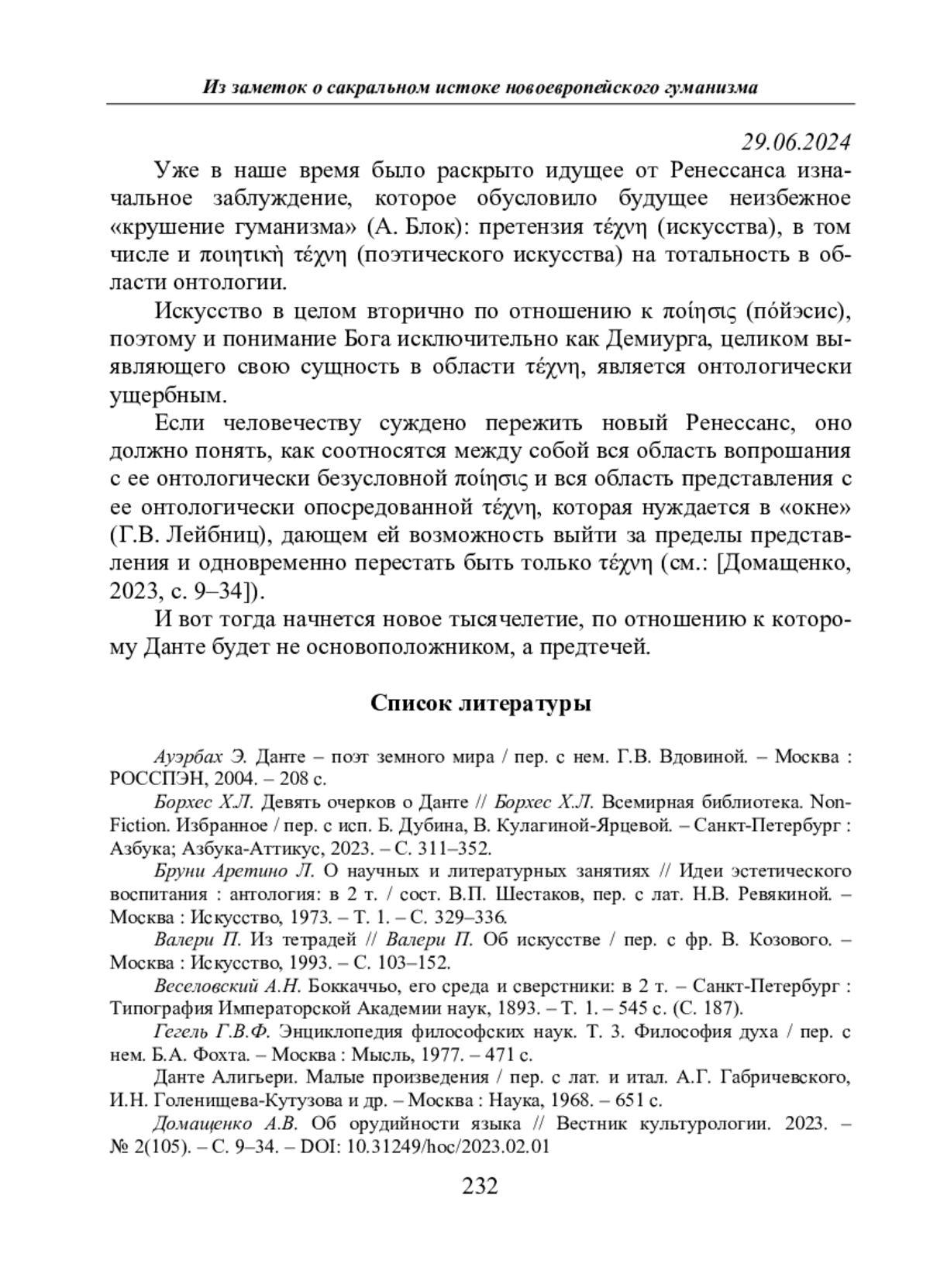 This work is a fragment from my yet unpublished book “Ars Poetica”. This large study, along with various problems of cultural studies, literary theory, historical poetics and comparative studies, examines questions about the genesis of the Renaissance and the connections between Russian literature of the 19th-20th centuries and the literary work of this period, which is the key to understanding all of modern European humanism. In the named study, Russian lyric poetry (F. I. Tyutchev, A. A. Blok and other Russian poets) and fiction (F. M. Dostoevsky, L. N. Tolstoy, M. A. Bulgakov and other Russian prose writers) are understood in the context of the works of Dante Alighieri, F. Petrarch, M. Cervantes, W. Shakespeare. The focus of this work, as the title indicates, is on the sacred origins of modern European humanism, the character of which was decisively determined by the work of Dante, and on the reflection of the problems associated with the literature of the early Renaissance in the works of Tyutchev and Blok. But the work also touches on the broader question of the significance of the early Renaissance for our era of the “collapse of humanism,” which I call the era of the limit (predel).