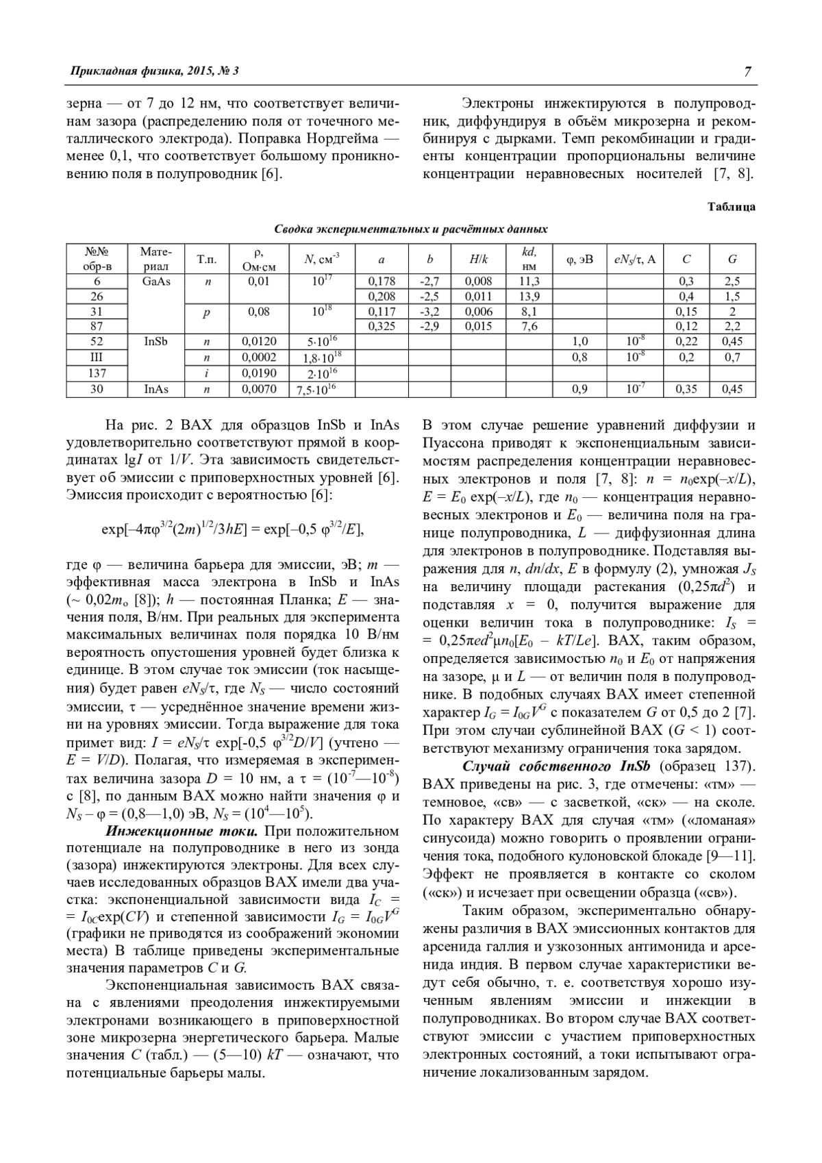 На туннельном микроскопе исследованы ВАХ в автоэмиссионном наноконтакте вольфрамовый микрозонд—микрозерно поверхности полупроводников А3В5. ВАХ эмиссии из зёрен GaAs соответствуют теории полевой эмиссии из металлов, а узкозонных InSb и InAs — эмиссии из приповерхностных электронных состояний. В режимах эмиссии и инжекции наблюдались важные для практики явления низкополевой эмиссии и ограничений тока локализованным зарядом. Результаты объясняются в рамках модели кулоновского взаимодействия и локализации лёгких электронов.