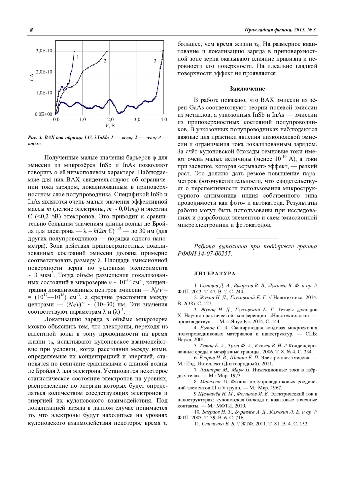 В работе показано, что ВАХ эмиссии из зё- рен GaAs соответствуют теории полевой эмиссии из металлов, а узкозонных InSb и InAs — эмиссии из приповерхностных состояний полупроводников. В узкозонных полупроводниках наблюдаются важные для практики явления низкополевой эмиссии и ограничения тока локализованным зарядом. За счёт кулоновской блокады темновые токи имеют очень малые величины (менее 10-10 А), а токи при засветке, которая «срывает» эффект, — резкий рост. Это должно дать резкое повышение параметров фоточувствительности, что свидетельствует о перспективности использования микроструктурного антимонида индия собственного типа проводимости как фото- и автокатода. Результаты работы могут быть использованы при исследованиях и разработках элементов и схем эмиссионной микроэлектроники и фотокатодов.
