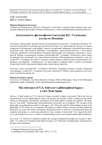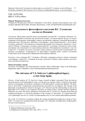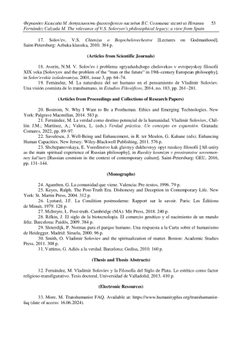 7. Fernández M. La naturaleza del ser humano en el pensamiento de Vladímir Soloviev. Una visión cosmista de lo transhumano // Estudios Filosóficos. 2014. No. 183. P. 261-281.