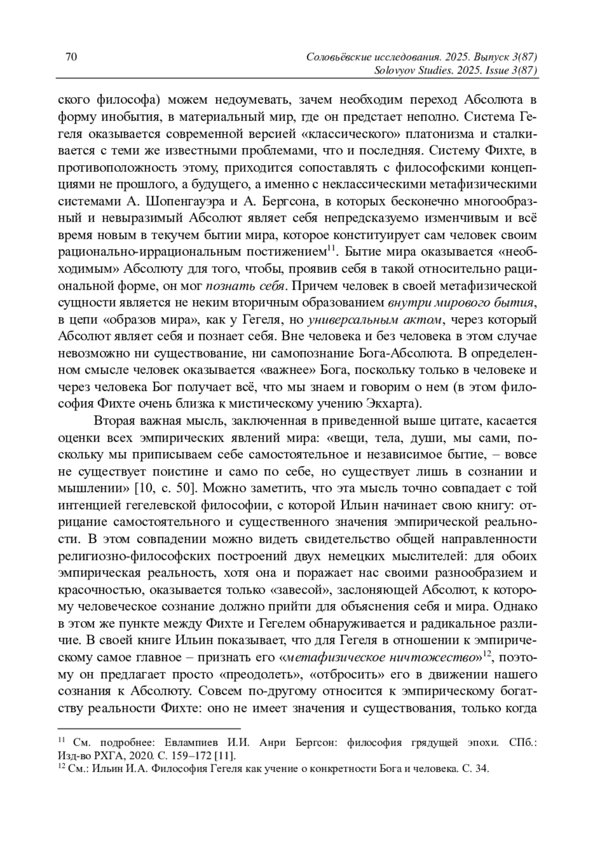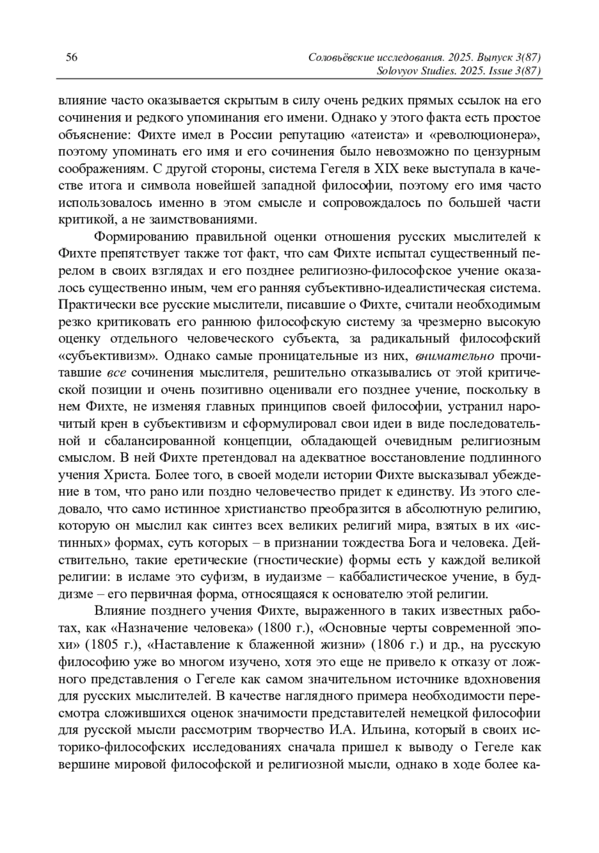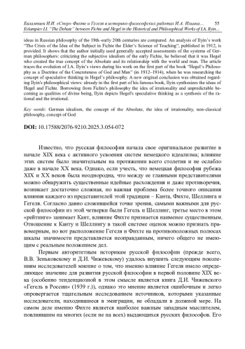 На примере историко-философских работ И. А. Ильина исследуется важная, но пока совершенно не разработанная проблема: сопоставляется степень влияния идей Фихте и Гегеля в русской философии XIX-начала ХХ века. Дан анализ работы Ильина «Кризис идеи субъекта в Наукоучении Фихте Старшего», опубликованной в 1912 году, в основе которой общепринятые оценки систем немецких философов: критика субъективного идеализма раннего Фихте, концепция Абсолюта и его отношений с миром и человеком Гегеля. Прослеживается эволюция взглядов И. А. Ильина (в 1912-1914 годы) во время работы над первой частью книги «Философия Гегеля как учение о конкретности Бога и человека», когда он исследовал понятие спекулятивного мышления в философии Гегеля. Получен новый, оригинальный вывод относительно философских взглядов Ильина: уже в первой части своей книги Ильин осуществляет синтез идей Гегеля и Фихте; заимствуя из философии Фихте идею иррациональности и непредсказуемого становления как качеств божественного бытия, Ильин изображает спекулятивное мышление Гегеля как синтез рационального и иррационального.