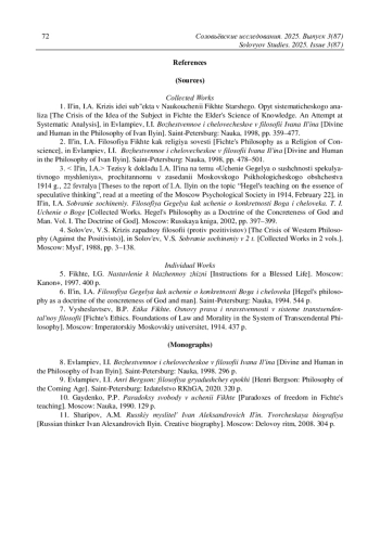 1. Ильин И.А. Кризис идеи субъекта в Наукоучении Фихте Старшего. Опыт систематического анализа // Евлампиев И.И. Божественное и человеческое в философии Ивана Ильина. СПб.: Наука, 1998. С. 359-477.