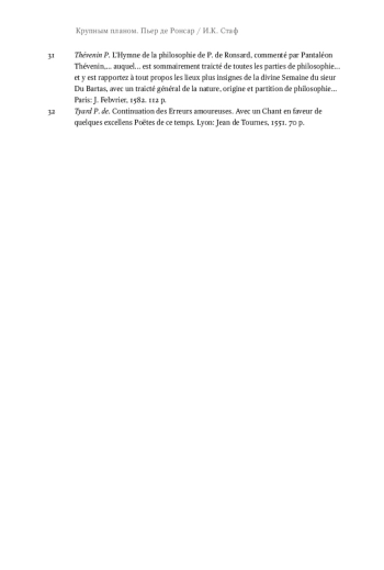 31. Thévenin P. L’Hymne de la philosophie de P. de Ronsard, commenté par Pantaléon Thévenin,.. auquel.. est sommairement traicté de toutes les parties de philosophie.. et y est rapportez à tout propos les lieux plus insignes de la divine Semaine du sieur Du Bartas, avec un traicté général de la nature, origine et partition de philosophie.. Paris: J. Febvrier, 1582. 112 p.