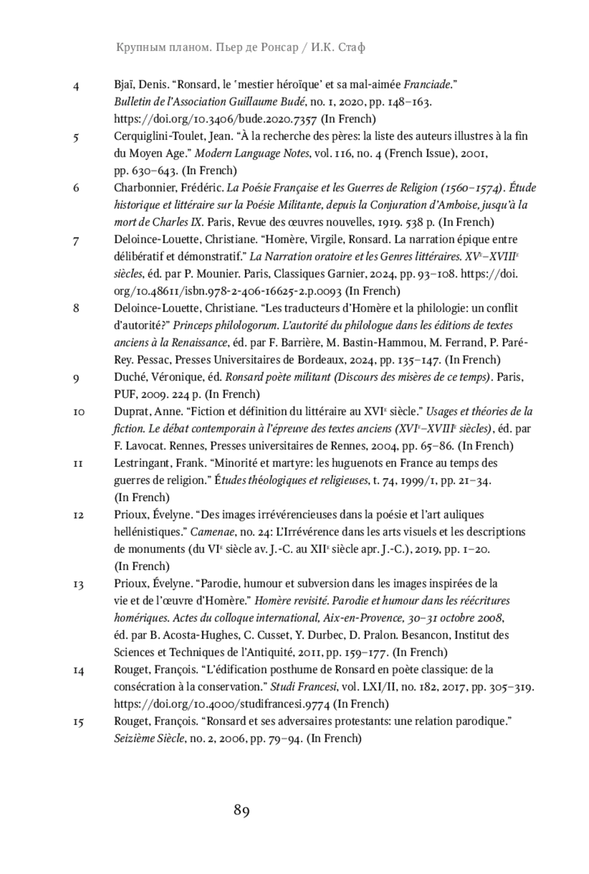 3. Bjaï, Denis. “La réception de La Franciade dans les dernières années de Ronsard”. La Poésie de la Pléiade. Héritage, influences, transmission. Paris, Classiques Garnier, 2009, рp. 259-274. DOI: 10.15122/isbn.978-2-8124-3969-8.p.0259