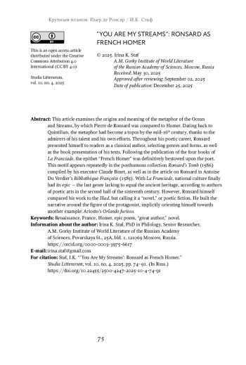 В статье рассматриваются истоки и семантика метафоры Океана и ручьев, посредством которой Пьер де Ронсар уподоблялся Гомеру. Метафора, восходящая к Квинтилиану, уже в середине XVI в. превратилась в топос как благодаря почитателям его дара, так и в результате его собственных усилий. Ронсар на протяжении всего поэтического пути стремился представить себя читателю как классического автора - через отбор жанров и форм, а также книжную презентацию текстов. После выхода в свет четырех книг «Франсиады» титул французского Гомера закрепился за поэтом окончательно: он стал сквозным мотивом посмертного сборника «Гробница Ронсара» (1586), составленного его душеприказчиком Клодом Бине, и статьи о Ронсаре во «Французской библиотеке» Антуана Дювердье (1585). Во «Франсиаде» национальная культура обрела свою эпопею, последний жанр, которого, по мнению авторов поэтических искусств второй половины XVI в., ей недоставало, чтобы сравняться с античным наследием. Однако сам Ронсар, сравнивавший свое творение с «Илиадой», именовал его «романом», поэтическим вымыслом, выстраивая повествование вокруг фигуры главного героя и имплицитно ориентируясь на иной образец - «Неистового Роланда» Ариосто.
