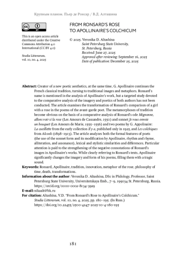 Creator of a new poetic aesthetics, at the same time, G. Apollinaire continues the French classical tradition, turning to traditional images and metaphors. Ronsard’s name is mentioned in the analysis of Apollinaire’s work, but a targeted study devoted to the comparative analysis of the imagery and poetics of both authors has not been conducted. The article examines the transformation of Ronsard’s comparison of a girl with a rose in the poems of the avant-garde poet. The metamorphoses of tradition become obvious on the basis of a comparative analysis of Ronsard’s ode Mignonne, allons voir si la rose (Les Amours de Cassandre, 1550) and sonnet Je vous envoie un bouquet (Les Amours de Marie, 1555–1556) and two poems by G. Appolinaire: La cueillette from the early collection Il y a, published only in 1925, and Les colchiques from Alcools (1898–1913). The article analyzes both the formal features of poets (the use of the sonnet form and its modification by Apollinaire, rhythm and rhyme, alliteration, and assonance), lexical and stylistic similarities and differences. Particular attention is paid to the strengthening of the negative connotations of Ronsard’s images in Apollinaire’s works. While clearly referring to Ronsard’s texts, Apollinaire significantly changes the imagery and form of his poems, filling them with a tragic sound.