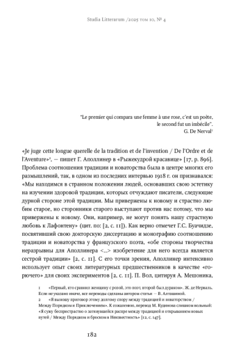 «Je juge cette longue querelle de la tradition et de l’invention / De l’Ordre et de l’Aventure»2, — пишет Г. Аполлинер в «Рыжекудрой красавице» [17, p. 896]. Проблема соотношения традиции и новаторства была в центре многих его размышлений, так, в одном из последних интервью 1918 г. он признавался: «Мы находимся в странном положении людей, основавших свою эстетику на изучении здоровой традиции, которых отчуждают писатели, следующие дурной стороне этой традиции. Мы привержены к новому и страстно любим старое, но сторонники старого выступают против нас потому, что мы привержены к новому. Они, например, не могут понять нашу страстную любовь к Лафонтену» (цит. по: [2, с. 11]). Как верно отмечет Г. С. Буачидзе, посвятивший свою докторскую диссертацию и монографию соотношению традиции и новаторства у французского поэта, «обе стороны творчества неразрывны для Аполлинера <…> изобретение для него всегда является сестрой традиции» [2, с. 11]. С его точки зрения, Аполлинер интенсивно использует опыт своих литературных предшественников в качестве «горючего» для своих экспериментов [2, с. 11]. П. Вол, цитируя А. Мешоника,..