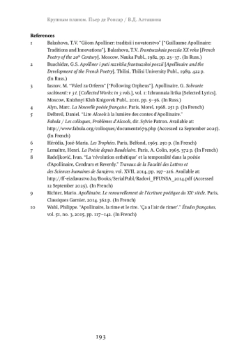 1. Балашова Т.В. Гийом Аполлинер: традиции и новаторство // Балашова Т.В. Французская поэзия ХХ века. М.: Наука, 1982. С. 23-37.