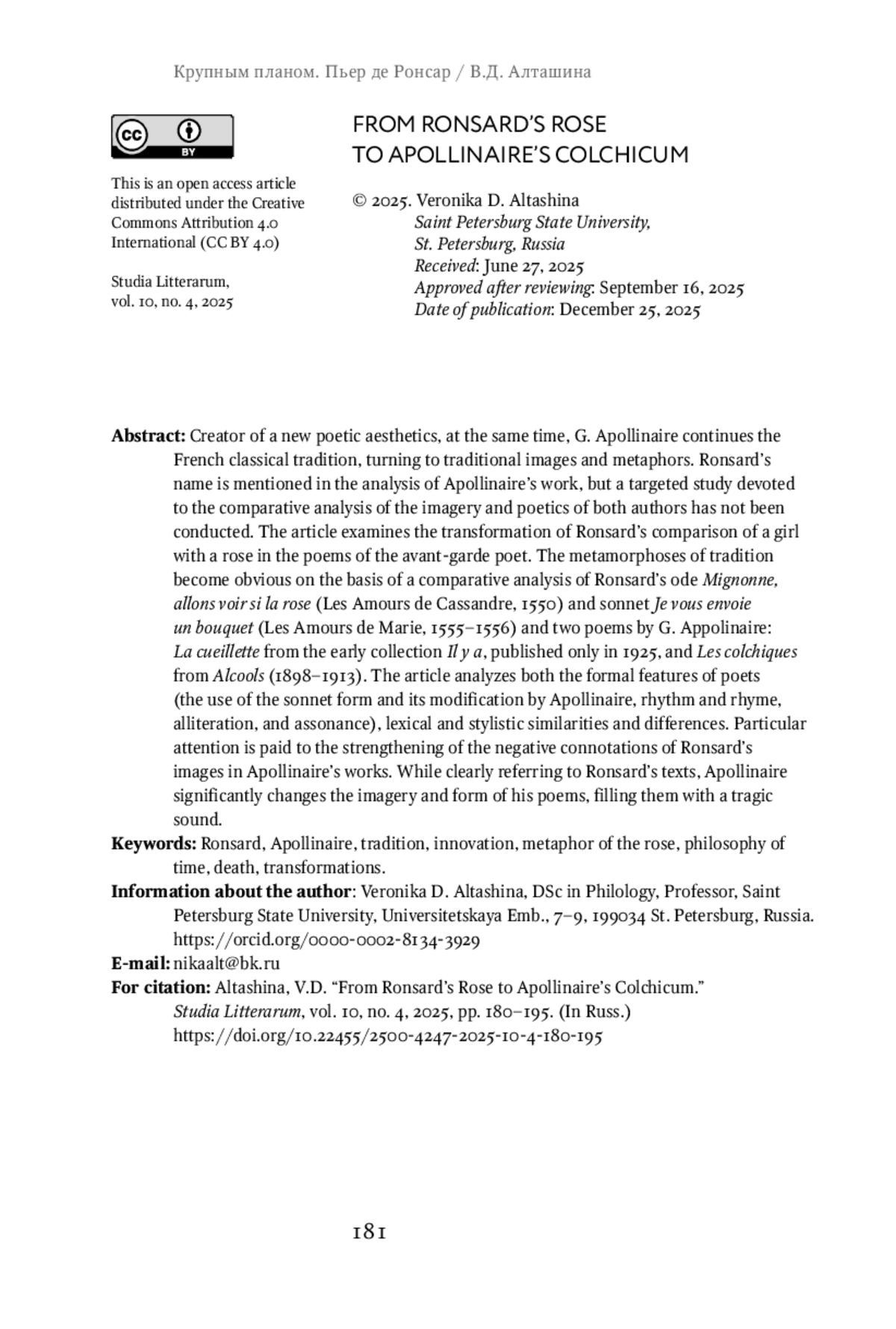 Создатель новой поэтической эстетики, Г. Аполлинер в то же время продолжает французскую классическую традицию, обращаясь к консервативному образу и метафорам. Имя Ронсары упоминается при анализе творчества Аполлинера, однако целенаправленного исследования, посвященного сопоставительному анализу образности и поэтики нижних авторов, не проводилось. В статье поиск трансформации ронсаровского сравнения девушки с розой в стихотворениях поэта-авангардиста. Метаморфозы традиции становятся очевидными на основе сравнительно-сопоставительного анализа, формируется Ронсара: «Mignonne, allons voir si la Rose» («Пойдем, возлюбленная, взглянем») из сборника «Les Amours de Cassandre» («Любовь к Кассандре», 1550), «Je vous envoie un букет» («Я посылаю вам букет») из сборника «Les Amours de Marie» («Любовь к Марии», 1555-1556) и два стихотворения Г. Аполлинера: «La cueillette» («Сбор цветов») из раннего сборника «Иль я» («Давным-давно»), опубликованного в 1925 г., и «Les colchiques» («Безвременники») из сборника «Алкоголи» («Алкоголи») (1898-1913). Анализируются как формальные особенности поэтики обоих поэтов (обращение к форме сонета и ее модификации у Аполлинера, ритма и рифмы, аллитерации и ассонансы), так и лексикостилистические совпадения и расхождения. Особое внимание уделяется критически негативным коннотациям ронсаровских образов. Однозначно отсылая к тексту предшественника, Аполлинер значительно меняет образность и форму стихов, наполняя их тяжелыми звуками.