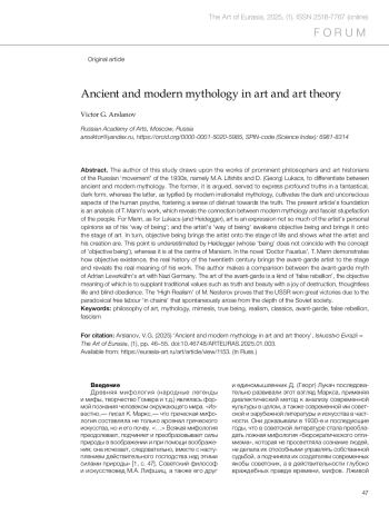 The author of this study draws upon the works of prominent philosophers and art historians of the Russian ‘movement’ of the 1930s, namely M. A. Lifshits and D. (Georg) Lukacs, to differentiate between ancient and modern mythology. The former, it is argued, served to express profound truths in a fantastical, dark form, whereas the latter, as typified by modern irrationalist mythology, cultivates the dark and unconscious aspects of the human psyche, fostering a sense of distrust towards the truth. The present article’s foundation is an analysis of T. Mann’s work, which reveals the connection between modern mythology and fascist stupefaction of the people. For Mann, as for Lukacs (and Heidegger), art is an expression not so much of the artist’s personal opinions as of his ‘way of being’; and the artist’s ‘way of being’ awakens objective being and brings it onto the stage of art. In turn, objective being brings the artist onto the stage of life and shows what the artist and his creation are. This point is underestimated by Heidegger (whose ‘being’ does not coincide with the concept of ‘objective being’), whereas it is at the centre of Marxism. In the novel ‘Doctor Faustus’, T. Mann demonstrates how objective existence, the real history of the twentieth century brings the avant-garde artist to the stage and reveals the real meaning of his work. The author makes a comparison between the avant-garde myth of Adrian Leverkühn’s art with Nazi Germany. The art of the avant-garde is a kind of ‘false rebellion’, the objective meaning of which is to supplant traditional values such as truth and beauty with a joy of destruction, thoughtless life and blind obedience. The ‘High Realism’ of M. Nesterov proves that the USSR won great victories due to the paradoxical free labour ‘in chains’ that spontaneously arose from the depth of the Soviet society.