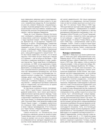Опираясь на работы философов и искусствоведов российского «течения» 1930-х годов М. А. Лифшица и Д. (Георга) Лукача, автор проводит различие между древней и современной мифологией. Если древняя мифология в фантастической темной форме выражала глубокие истины, то современная иррационалистическая мифология культивирует всё темное и бессознательное в человеке, не доверяя истине. Связь современной мифологии с фашистским одурманиванием народа раскрыта в творчестве Т. Манна, анализ которого лежит в основе настоящей статьи. Для Манна, как для Лукача (и Хайдеггера) искусство, - выражение не столько личных мнений художника, сколько его «способа бытия»; «способ бытия» художника пробуждает объективное бытие и выводит его на сцену искусства. В свою очередь объективное бытие выводит художника на сцену жизни и показывает, что собой представляют художник и его творение. Этот момент недооценивается Хайдеггером («бытие» которого не совпадает с понятием «объективное бытие»), тогда как он находится в центре марксизма. В романе «Доктор Фаустус» Т. Манн демонстрирует, как объективное бытие, реальная история ХХ века выводит на сцену художника-авангардиста и раскрывает действительный смысл его творчества. Авангардистский миф искусства Адриана Леверкюна сопоставляется с нацистской Германией. Искусство авангарда рассматривается как разновидность «ложного бунта», объективный смысл которого - заменить истину и красоту радостью разрушения, бездумной жизни и слепого повиновения. «Высокий реализм» М. Нестерова доказывает, что СССР одержал великие победы благодаря парадоксальному свободному труду «в цепях», стихийно возникавшему в порах советского общества.