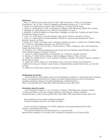 7. Лосев А.Ф. История античной эстетики: итоги тысячелетнего развития: в 2 кн. Кн. 2. М.: Искусство, 1994. 604 с. 8. Лифшиц М.А. Античный мир, мифология, эстетическое воспитание // Лифшиц М.А. Собрание сочинений: в 3 т. Т. 3. М.: Изобразительное искусство, 1988. C. 336-428.