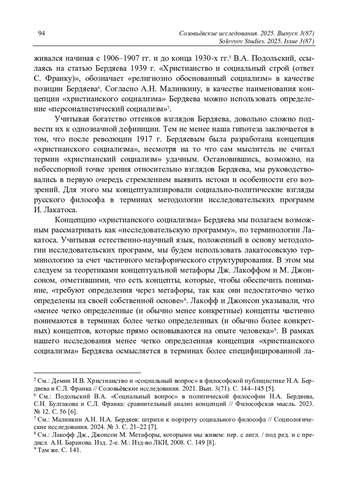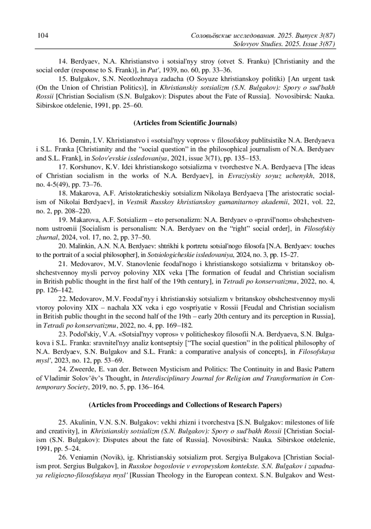 5. Демин И.В. Христианство и “социальный вопрос” в философской публицистике Н.А. Бердяева и С.Л. Франка // Соловьёвские исследования. 2021. Вып. 3(71). С. 135-153.