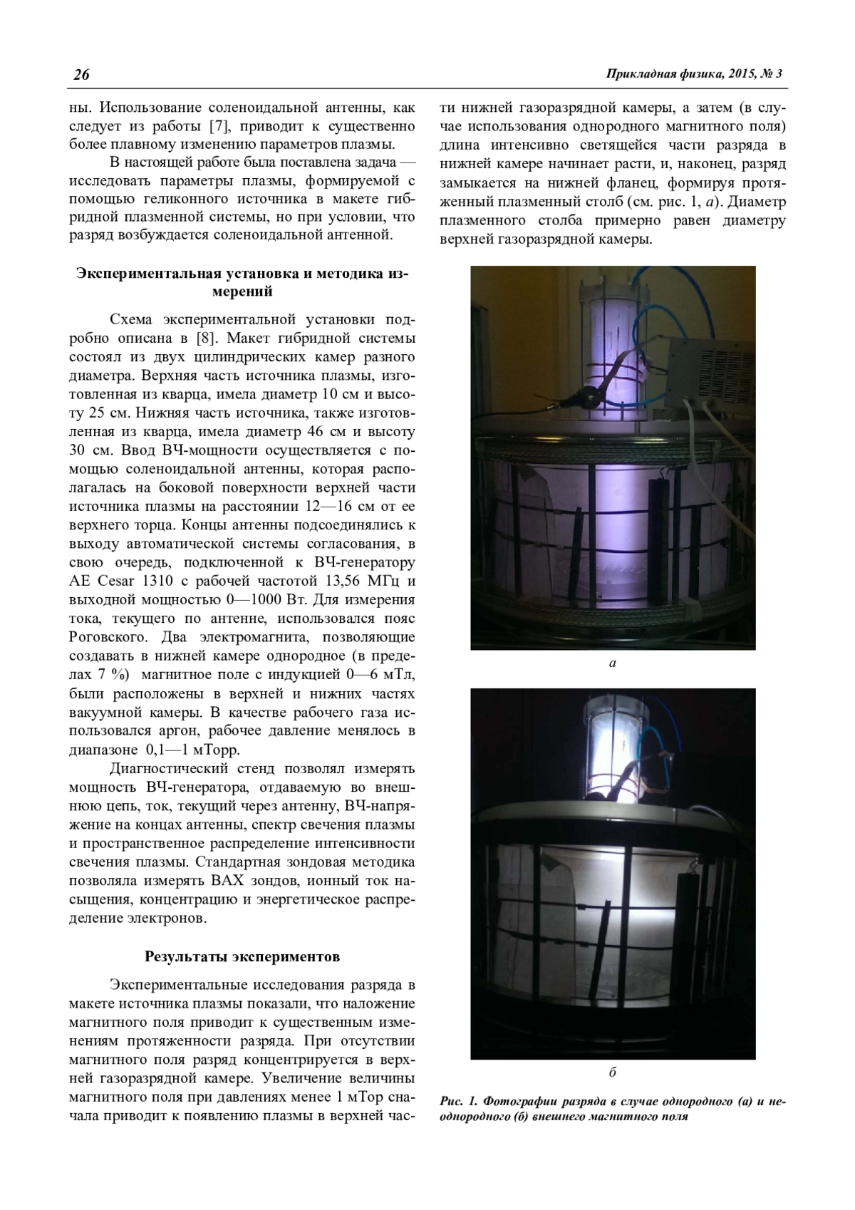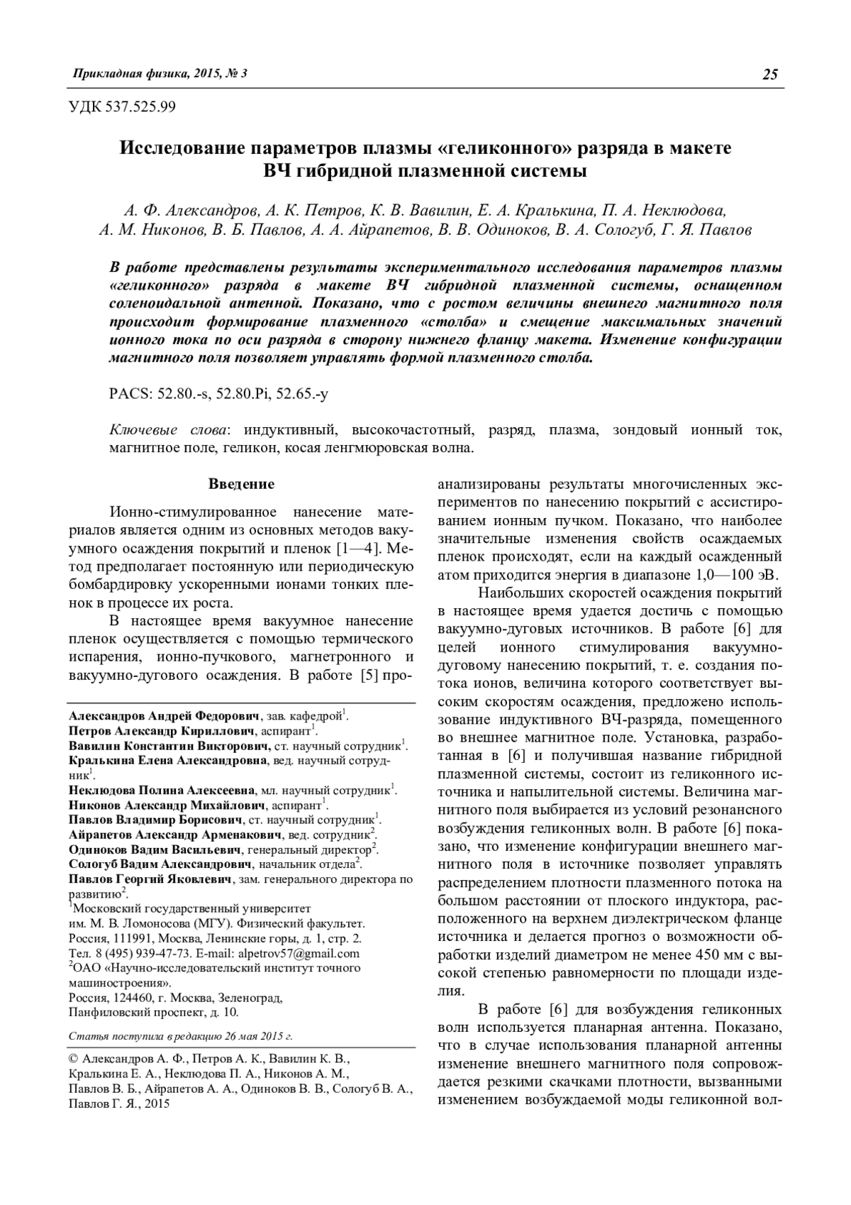 Александров А. Ф., Петров А. К., Вавилин К. В., Кралькина Е. А., Неклюдова П. А., Никонов А. М., Павлов В. Б., Айрапетов А. А., Одиноков В. В., Сологуб В. А., Павлов Г. Я. Исследование параметров плазмы «геликонного» разряда в макете ВЧ гибридной плазменной системы 25