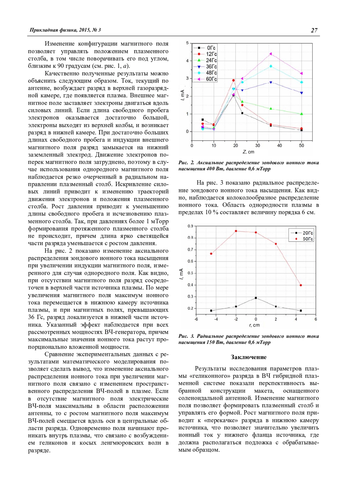 Результаты исследования параметров плазмы «геликонного» разряда в ВЧ гибридной плазменной системе показали перспективность выбранной конструкции макета, оснащенного соленоидальной антенной. Изменение магнитного поля позволяет формировать плазменный столб и управлять его формой. Рост магнитного поля приводит к «перекачке» разряда в нижнюю камеру источника, что позволяет значительно увеличить ионный ток у нижнего фланца источника, где должна располагаться подложка с обрабатываемым образцом.