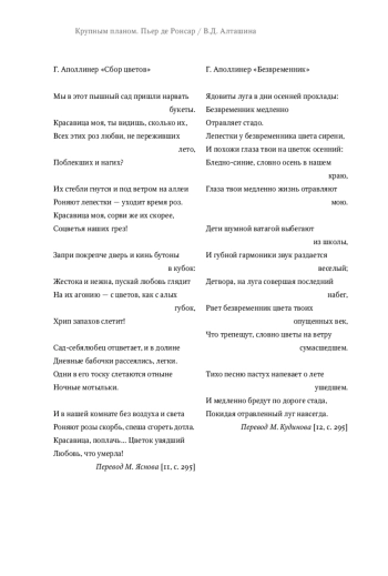 Создатель новой поэтической эстетики, Г. Аполлинер в то же время продолжает французскую классическую традицию, обращаясь к консервативному образу и метафорам. Имя Ронсары упоминается при анализе творчества Аполлинера, однако целенаправленного исследования, посвященного сопоставительному анализу образности и поэтики нижних авторов, не проводилось. В статье поиск трансформации ронсаровского сравнения девушки с розой в стихотворениях поэта-авангардиста. Метаморфозы традиции становятся очевидными на основе сравнительно-сопоставительного анализа, формируется Ронсара: «Mignonne, allons voir si la Rose» («Пойдем, возлюбленная, взглянем») из сборника «Les Amours de Cassandre» («Любовь к Кассандре», 1550), «Je vous envoie un букет» («Я посылаю вам букет») из сборника «Les Amours de Marie» («Любовь к Марии», 1555-1556) и два стихотворения Г. Аполлинера: «La cueillette» («Сбор цветов») из раннего сборника «Иль я» («Давным-давно»), опубликованного в 1925 г., и «Les colchiques» («Безвременники») из сборника «Алкоголи» («Алкоголи») (1898-1913). Анализируются как формальные особенности поэтики обоих поэтов (обращение к форме сонета и ее модификации у Аполлинера, ритма и рифмы, аллитерации и ассонансы), так и лексикостилистические совпадения и расхождения. Особое внимание уделяется критически негативным коннотациям ронсаровских образов. Однозначно отсылая к тексту предшественника, Аполлинер значительно меняет образность и форму стихов, наполняя их тяжелыми звуками.