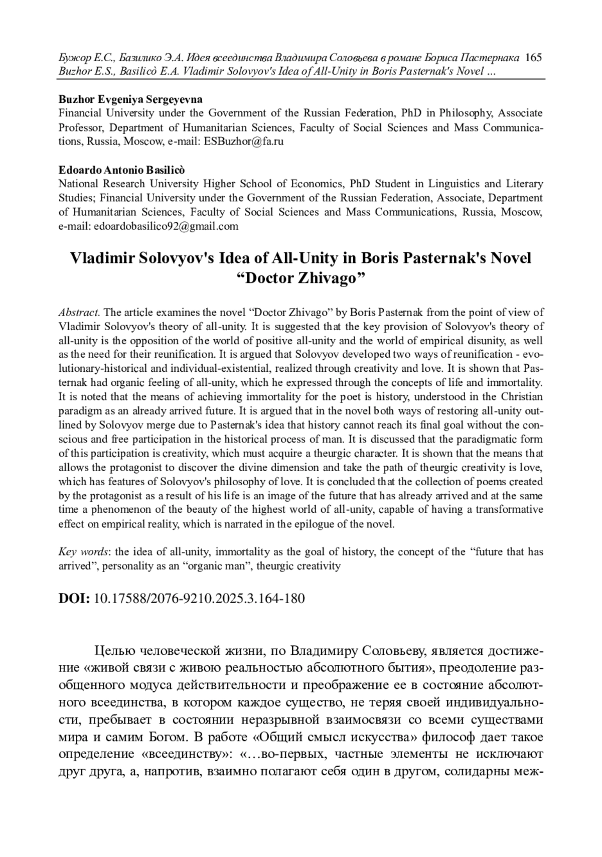 Рассматривается роман «Доктор Живаго» Бориса Пастернака с точки зрения теории всеединства Владимира Соловьева. Проводится мысль о том, что ключевым положением теории всеединства Соловьева является идея противостояния мира положительного всеединства и мира эмпирической разобщенности, а также необходимость их воссоединения. Утверждается, что Соловьевым разработаны два пути воссоединения - эволюционно-исторический и индивидуально-экзистенциальный, осуществляемый через творчество и любовь. Отмечено чувство всеединства, присущее Пастернаку, выражаемое им через понятия жизни и бессмертия, средством достижения которого для поэта является история, понимаемая им в христианской парадигме как уже наставшее будущее. Утверждается, что в романе оба пути восстановления всеединства, намеченные Соловьевым, сливаются благодаря идее Пастернака, согласно которой история не сможет прийти к своей финальной цели без сознательного и свободного участия в историческом процессе человека. Обсуждается, что парадигмальной формой этого участия является творчество, которое должно приобрести теургический характер. Показано, что средством, позволяющим главному герою романа раскрыть божественное измерение на пути теургического творчества, является философия любви Соловьева. Делается вывод, что сборник стихов, созданный главным героем как итог его жизни, представляет собой образ наступившего будущего и одновременно явление красоты высшего мира всеединства, способной оказывать преобразующее воздействие на эмпирическую действительность, о чем повествуется в эпилоге романа.