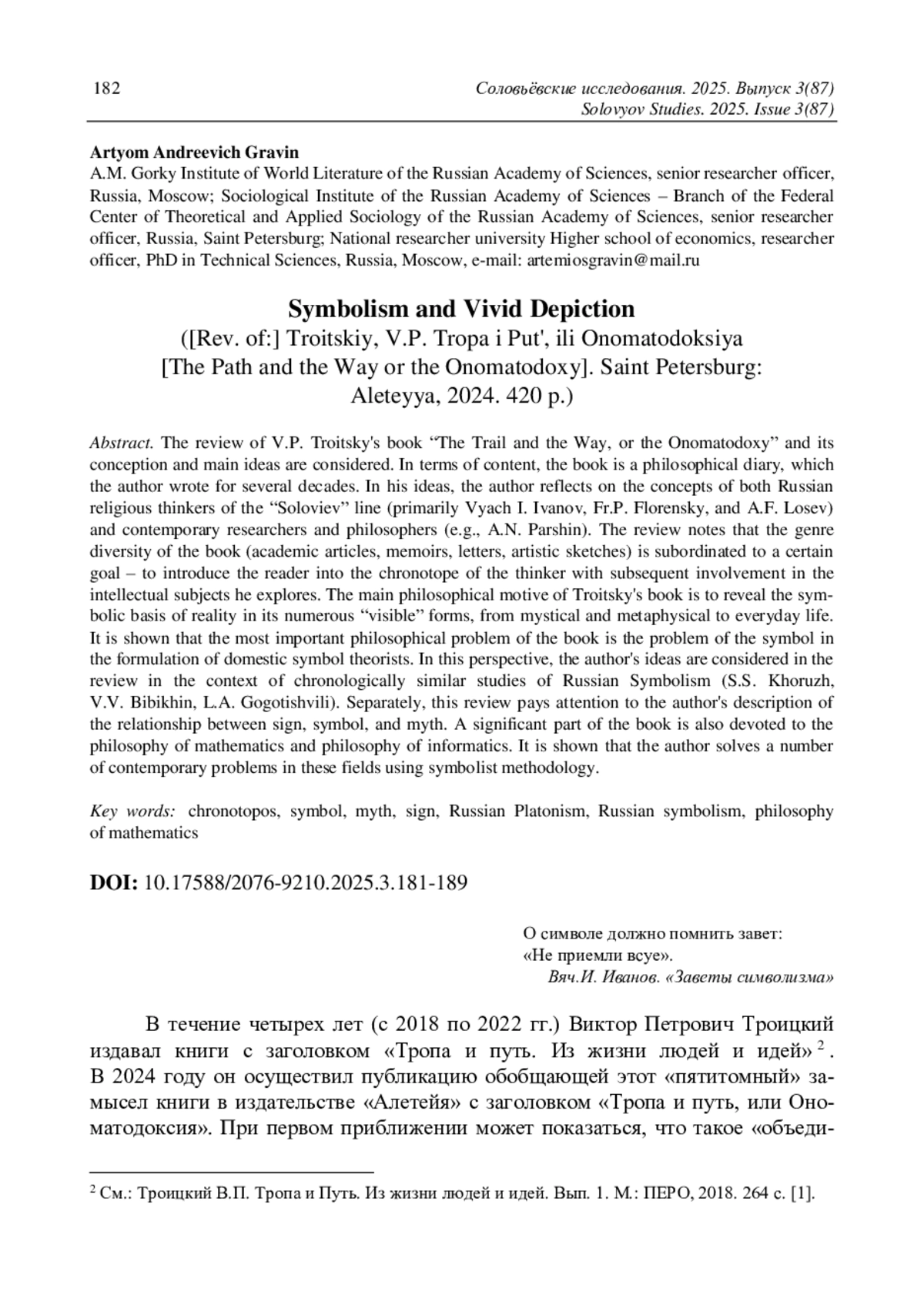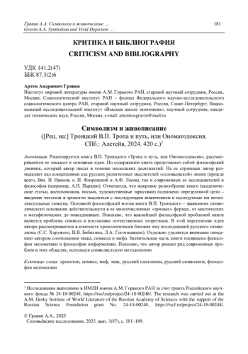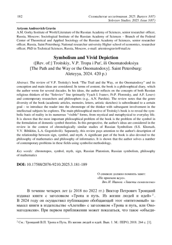 Рецензируется книга В. П. Троицкого «Тропа и путь, или Ономатодоксия», рассматриваются ее замысел и основные идеи. По содержанию книга представляет собой философский дневник, который автор писал в течение нескольких десятилетий. На ее страницах автор размышляет над концепциями как русских религиозных мыслителей «соловьевской» линии (прежде всего, Вяч. И. Иванов, о. П. Флоренский и А. Ф. Лосев), так и современных ее исследователей и философов (например, А. Н. Паршин). Отмечается, что жанровое разнообразие книги (академические статьи, воспоминания, письма, художественные зарисовки) подчинено определенной цели - введения читателя в хронотоп мыслителя с последующим вовлечением в исследуемые им интеллектуальные сюжеты. Основной философский мотив книги В. П. Троицкого - выявление символического основания действительности в ее многочисленных «зримых» формах, от мистических и метафизических до повседневных. Показано, что важнейшей философской проблемой книги является проблема символа в постановке отечественных теоретиков. В этой перспективе идеи автора рассматриваются в контексте хронологически близких ему исследований русского символизма (С. С. Хоружего, В. В. Бибихина, Л. А. Гоготишвили). Отдельно уделяется внимание описанию автором соотношения знака, символа и мифа. Значительная часть книги посвящена философии математики и философии информатики. Показано, что автор решает ряд современных проблем в этих областях, используя символистскую методологию.