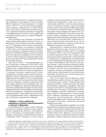 In the sections «Eurasian Heritage» and «Art of the 20th–21st Centuries», materials are presented on women’s jewellery and the image of the lion in Chinese mythology, as well as on the works of Kazimir Zelenevsky, Rameses Yuan, Alexander Kocharov and Russian artists who have embodied the image of Mongolia. The main theme is mythology in contemporary art («Forum»): myths inspire artists (the exhibition at the Russian Academy of Arts was a success), who are drawn to their poetic quality and connection with tradition. Remythologisation is observed: myths are transformed into constructs for manipulating consciousness. According to Schelling, mythology is the «world of archetypes», and art is their depiction — therefore, myth is the foundation of art.