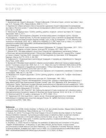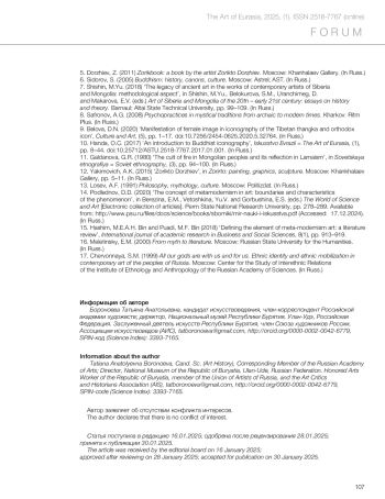 12. Yakimovich, A.K. (2015) ‘Zorikto Dorzhiev’, in Zorirto: painting, graphics, sculpture. Moscow: Khankhalaev Gallery, pp. 5–11. (In Russ.)