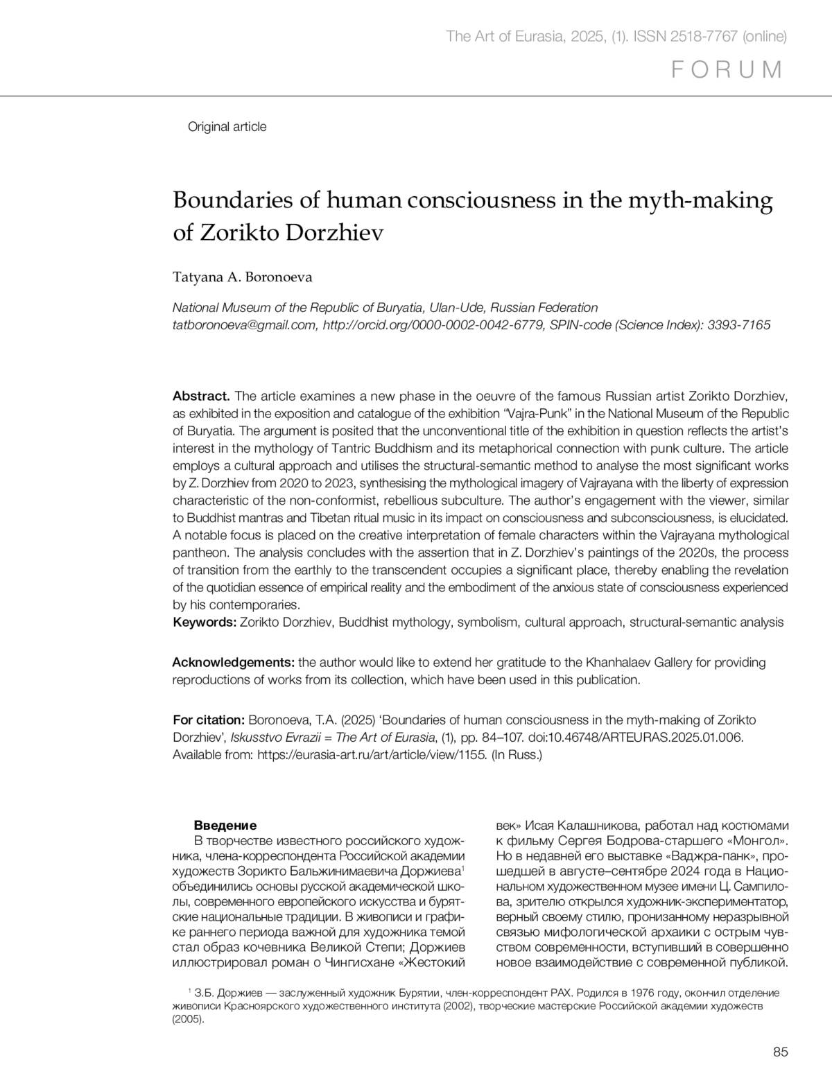 Бороноева Т.А. Границы человеческого сознания в мифотворчестве Зорикто Доржиева // Искусство Евразии [Электронный журнал]. 2025. No 1 (36). С. 84–107.