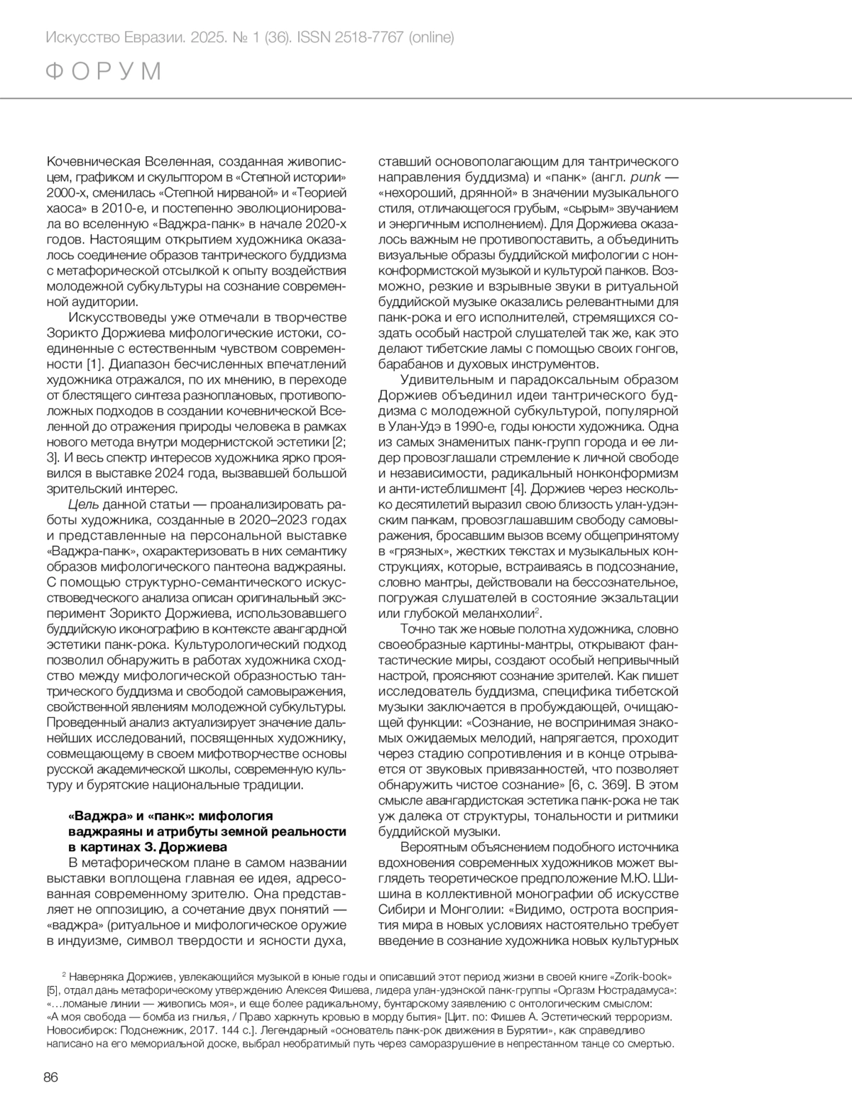 В статье рассматривается новый этап творчества известного российского художника Зорикто Доржиева, представленный в экспозиции и каталоге выставки «Ваджра-панк» в Национальном музее Республики Бурятия. Утверждается, что в названии выставки отражен интерес художника к мифологии тантрического буддизма и ее метафорической связи с панк-культурой. В контексте культурологического подхода и с использованием структурно-семантического метода анализируются наиболее значимые произведения З. Доржиева 2020-2023 годов, сочетающие мифологическую образность ваджраяны и свободу самовыражения, свойственную нонконформистской, бунтарской субкультуре. Дается объяснение диалогу автора со зрителем, по воздействию на сознание и подсознание схожему с буддийскими мантрами и тибетской ритуальной музыкой. Особое место отведено творческой интерпретации женских персонажей в мифологическом пантеоне ваджраяны. Сделан вывод о том, что в картинах З. Доржиева 2020-х годов важное место занимает процесс перехода от земного к трансцендентному, позволяющий раскрыть бытийную сущность эмпирической реальности, воплотить тревожное состояние сознания своего современника.