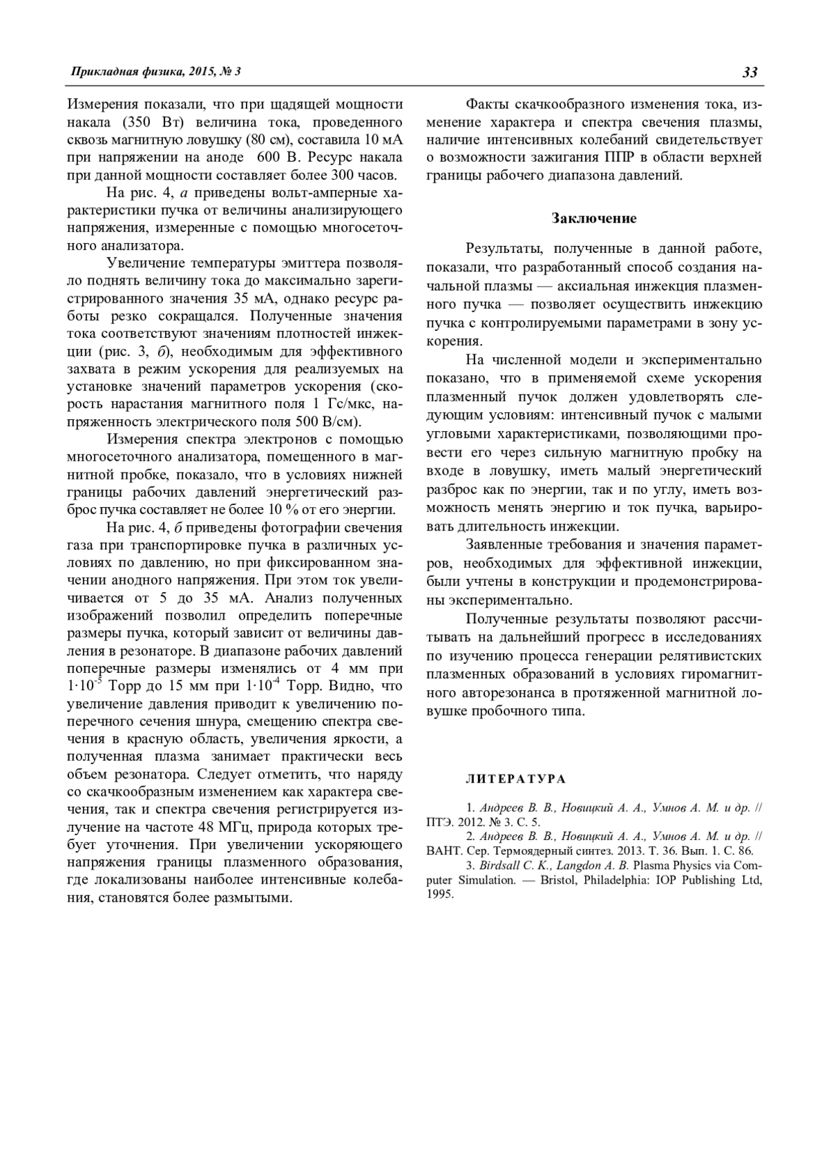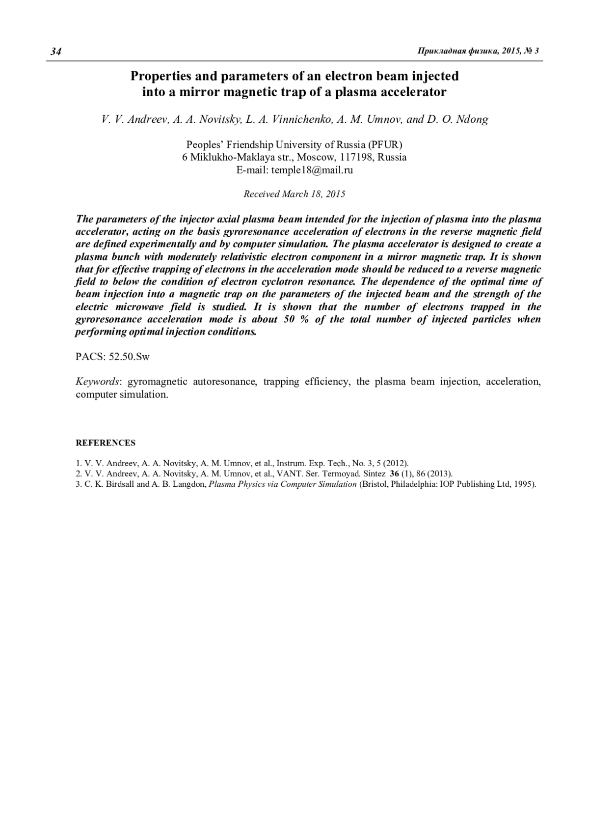 Андреев В. В., Новицкий А. А., Винниченко Л. А., Умнов А. М., Ндонг Д. Д. Параметры электронного пучка, инжектируемого в магнитную ловушку плазменного ускорителя 29
