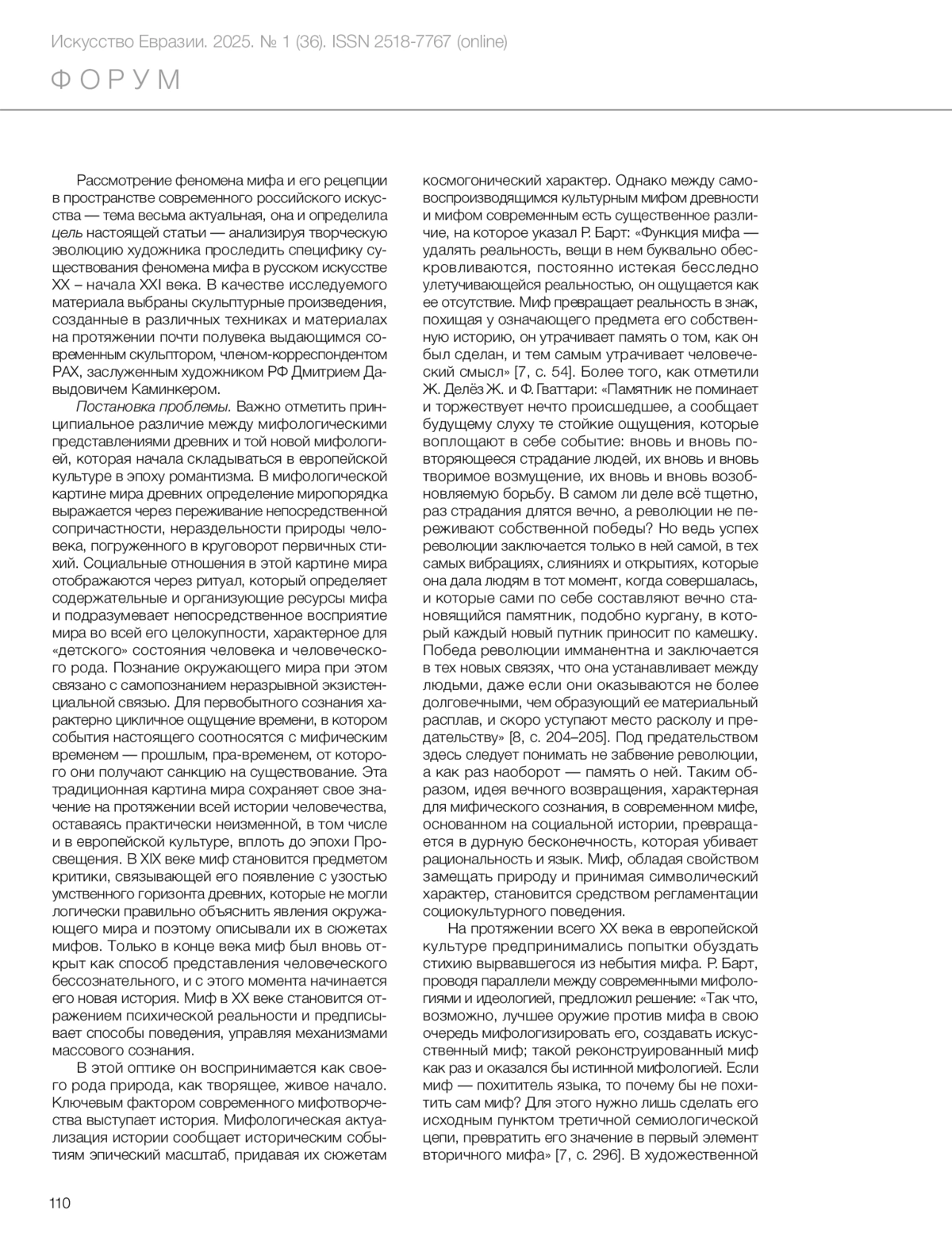 Статья посвящена изучению роли мифа в современном искусстве России на примере творчества известного скульптора Дмитрия Давыдовича Каминкера, в произведениях которого значительное место занимает проблематика функционирования мифа в обществе и культуре. Указывая на определяющую роль мифа как ключевого механизма, обусловливающего действия массового сознания в глобальной социальной и культурной жизни XX века, автор ставит актуальную для творческой практики современных художников проблему преодоления репрессивного характера, который принимает миф в эту эпоху. В статье последовательно рассматриваются ключевые проекты художника. Особое внимание уделяется тому, как элементы различных мифологических систем перекликаются с культурными и социальными реалиями нашего времени, создавая многослойные нарративы, которые отражают сложность современного существования. Характерным для творческого метода Каминкера является работа сериями, объединенными единым замыслом в художественные проекты, включающие в себя элементы обряда, мистического действа, сакрализованной театральности и современного перформанса. Художник создает целостную картину современного мира, предлагая зрителю задуматься о своем месте в нем. Автор статьи показывает, что Каминкер использует миф не в качестве средства обогащения художественного языка, а сущностно, для объяснения человеческого опыта, оперируя универсальными темами, такими как любовь, страдание, поиск смысла и идентичности. В заключение делается вывод о том, что миф в работах Каминкера служит для осмысления и интерпретации актуальных социальных и культурных вопросов, что делает его творчество значимым вкладом в современное искусство.