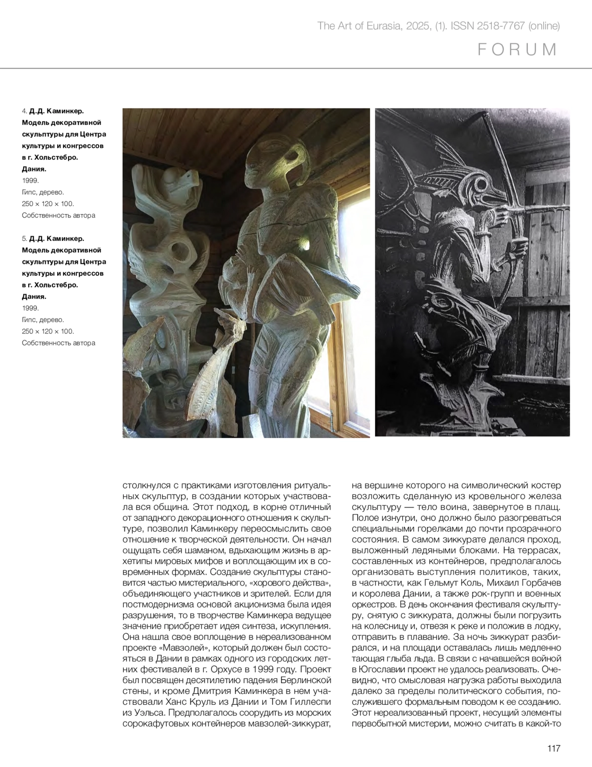 The article is devoted to the study of the role of myth in modern Russian art using the example of the work of the well-known sculptor Dmitry Davydovich Kaminker, in whose works the problems of the functioning of myth in society and culture occupy a significant place. Pointing to the defining role of myth as a key mechanism that determines the actions of mass consciousness in the global social and cultural life of the 20th century, the author poses a problem that is relevant for the creative practice of contemporary artists: overcoming the repressive nature that myth takes on in this era. The study consistently examines the artist’s key projects in which mythical imagination is manifested. Particular attention is paid to how these elements of various mythological systems echo the cultural and social realities of our time, creating multi-layered narratives that reflect the complexity of modern existence. Characteristic of Kaminker’s creative method is working in series, united by a single concept in artistic projects that include elements of ritual, mystical action and sacralized theatricality. The author of the article analyses how D. Kaminker uses myth as a tool to explain human experience, allowing viewers to come into contact with universal themes such as love, suffering, the search for meaning and identity. Through archetypes and mythological subjects, the artist recreates a holistic picture of the modern world, inviting viewers to think about their place in it. It is concluded that myth in Kaminker’s works not only enriches the artistic language, but also serves as an important means for understanding and interpreting current social and cultural issues, which makes his work a significant contribution to contemporary art.