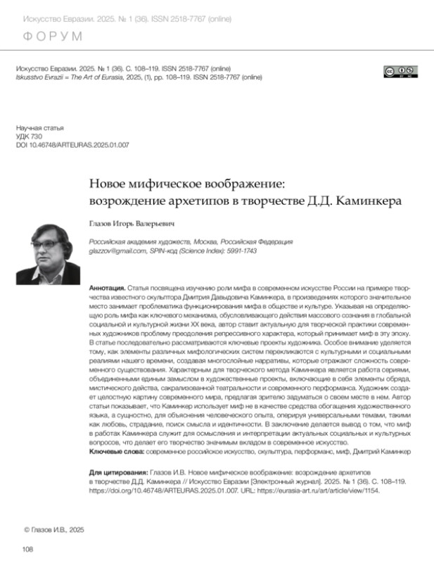 Глазов И.В. Новое мифическое воображение: возрождение архетипов в творчестве Д.Д. Каминкера // Искусство Евразии [Электронный журнал]. 2025. No 1 (36). С. 108–119.