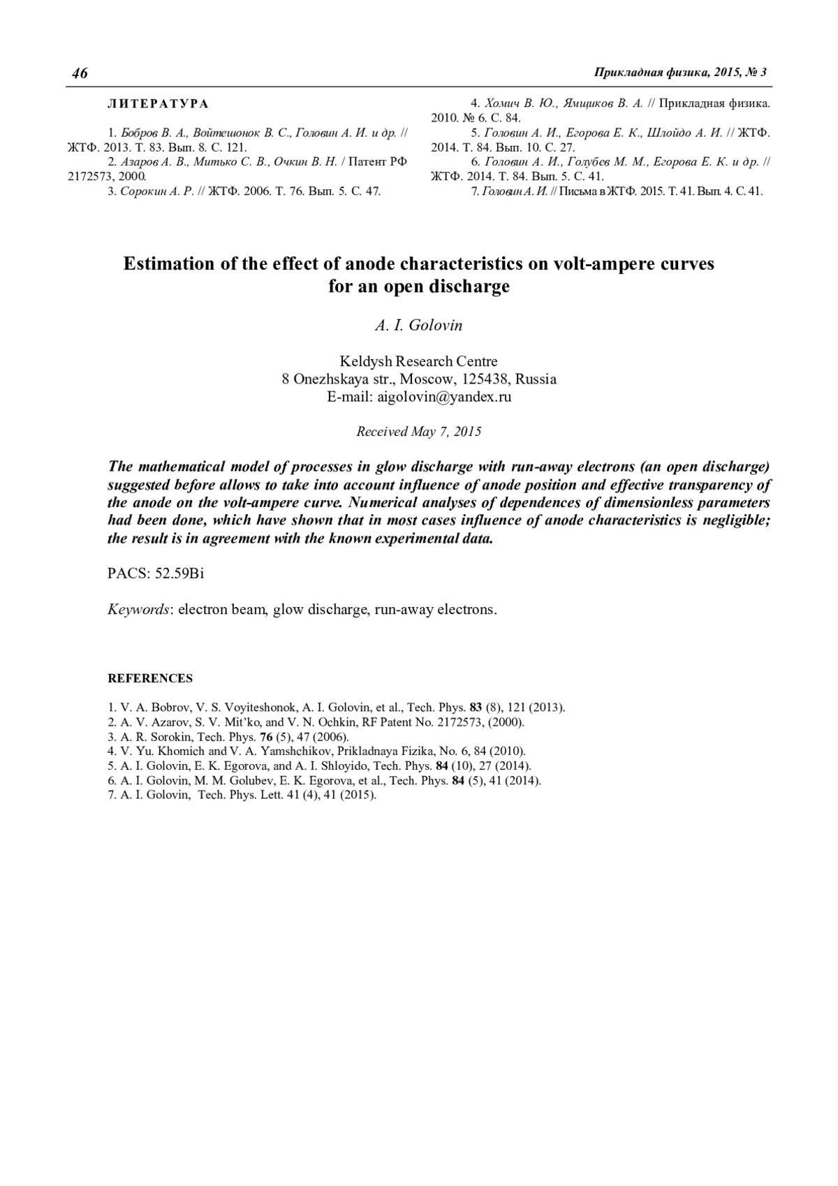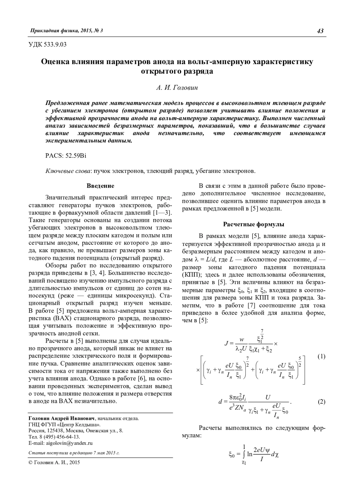 Головин А. И. Оценка влияния параметров анода на вольт-амперную характеристику открытого разряда 43