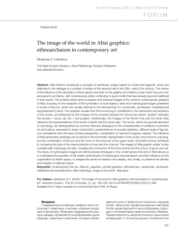 Altai folklore constitutes a complex of narratives, largely based on myths and legends, which are reflected in the heritage of a number of artists of the second half of the 20th - early 21st century. The theme of the influence of the semantics of ritual objects and texts on the graphic art of Altai is a topic which has yet to be exhausted in art history, with contemporary artists continuing to quote motifs that have already become traditional in their works. The present article aims to analyse and interpret images of the world in contemporary graphics of Altai, focusing on the reception of the symbolism of ritual objects, texts and mythological images presented in works of fine art, which are usually referred to the ethnoarchaic (or neoarchaic, archaeoart, metahistorical expressionism) trend. The analysis reveals that the borrowing is manifested in the semantics and stylistics of the works, as evidenced by the images of the universe divided into structures where “guides” between the worlds - wood, ail, fire - are present. Additionally, the images of the World Tree and the Khan Altai reference the representations of the world of spirits and the heroic epic. The works, which incorporate elements of mythology, are distinguished by common features analogous to the characteristics of artefacts of primitive art and culture, expressed in linear construction, predominance of rounded plasticity, different scale of figures, non-compliance with the laws of linear perspective, combination of real and imaginary objects. The influence of Altai tambourine drawings can be traced in the schematic representation of the world, monochrome colouring, and the combination of the sun and the moon in the structure of the upper world. Decorative forms contribute to conveying the idea of the interconnection of man and the cosmos. The images of Altai graphic artists’ works correlate with mythology and epic, revealing the connection of the three worlds and the victory of good over evil. The study of mythological images and ethnocultural archetypes in the contemporary fine arts of Altai allows us to understand the specifics of the artistic embodiment of mythological representations and their influence on the organisation of artistic space, to analyse the works of masters more deeply, and, finally, to preserve the identity and integrity of national culture.