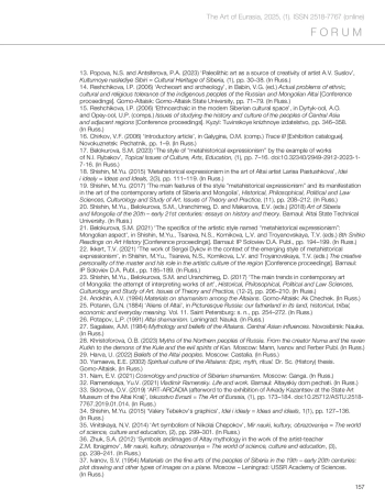 39. Vinitskaya, N.V. (2017) ‘Mythological images of Altai and their interpretation in the fine arts’, Kulturnoye naslediye Sibiri = Cultural Heritage of Siberia, 6(24), pp. 12–24. (In Russ.)