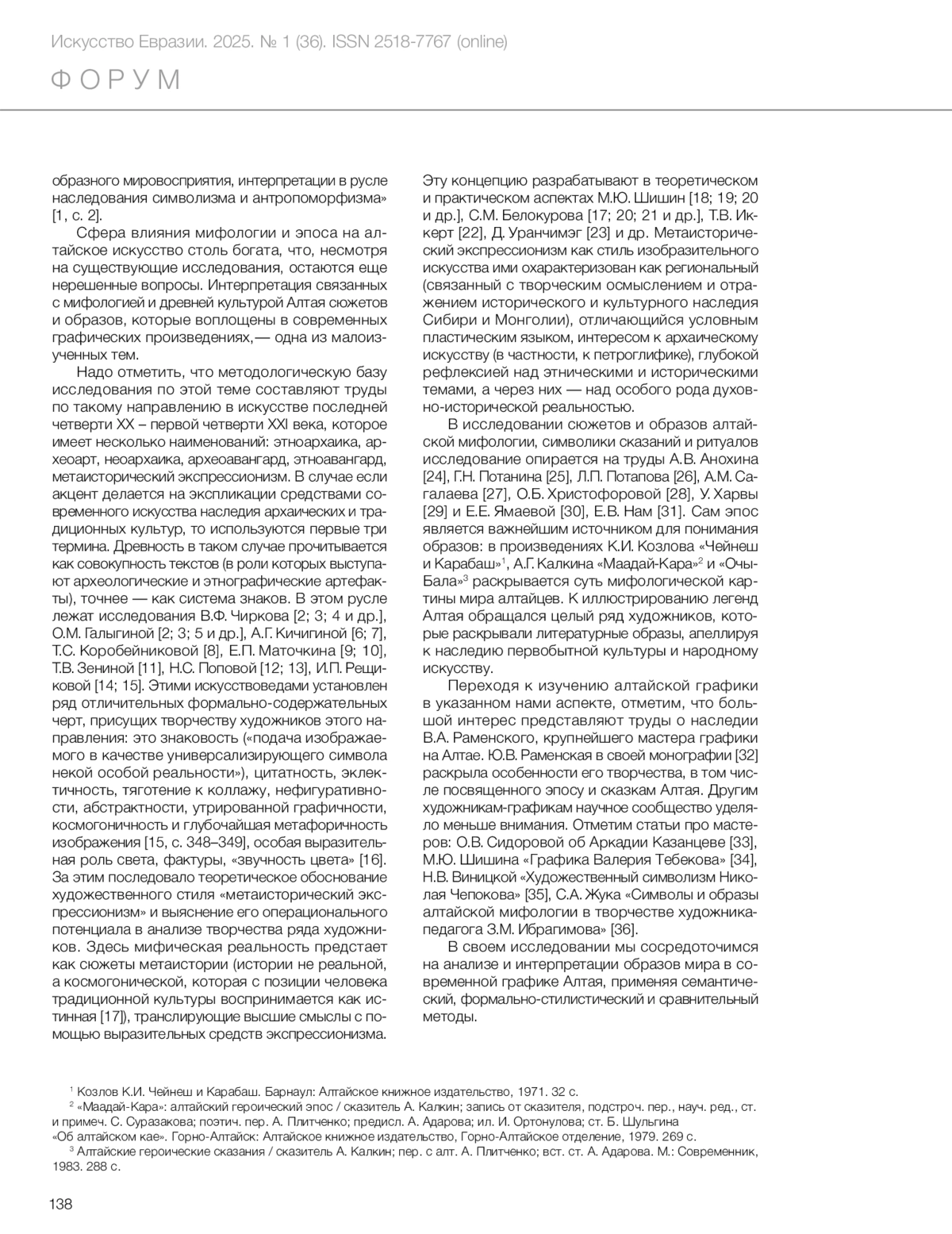 40. Chinina, A.V. (2020) ‘N. Chepokov’s creativity as a manifestation of the Siberian mentality of the “neoarchaic”’, Etnografiya Altaya i sopredel’nykh territoriy = Ethnography of Altai and adjacent territories, (10), pp. 361–364. doi:10.37386/2687-0592-2020-10-361-364. (In Russ.)