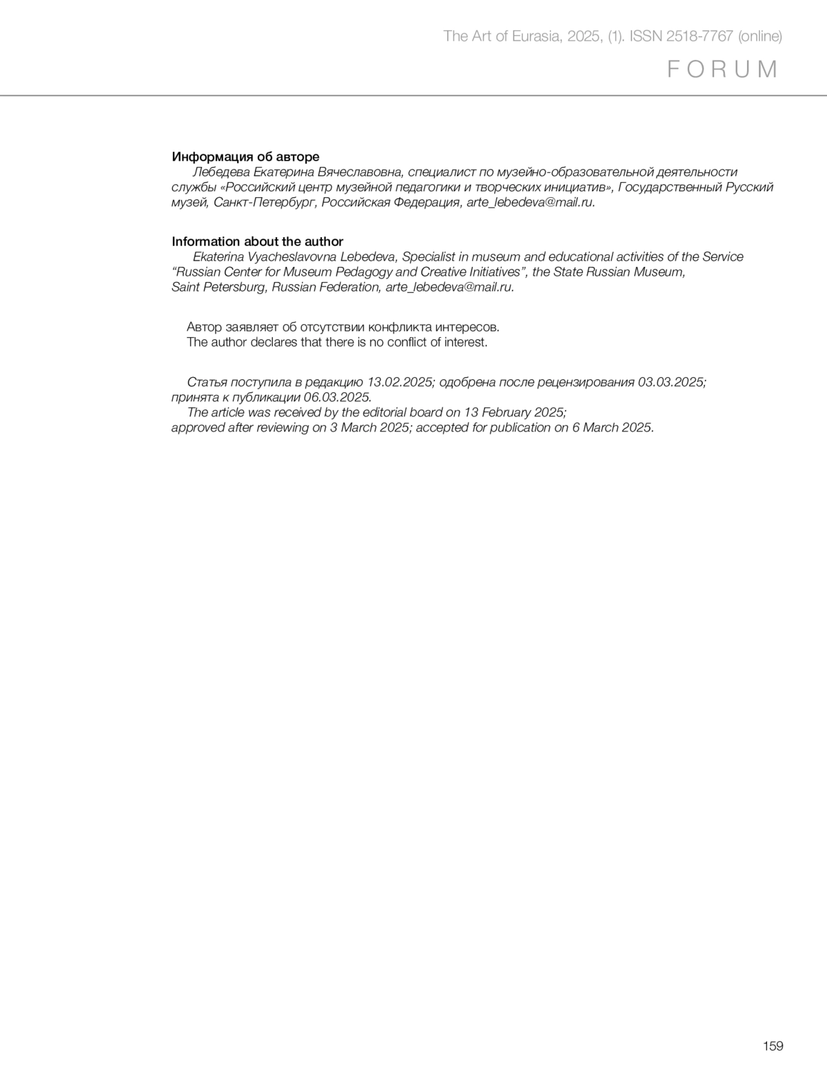 5. Galygina, O.M. (2015) ‘Siberian Neo‑archaic’, Iskusstvo Evrazii = The Art of Eurasia, (1), pp. 135–138. doi:10.25712/ASTU.2518-7767.2015.01.011. (In Russ.)