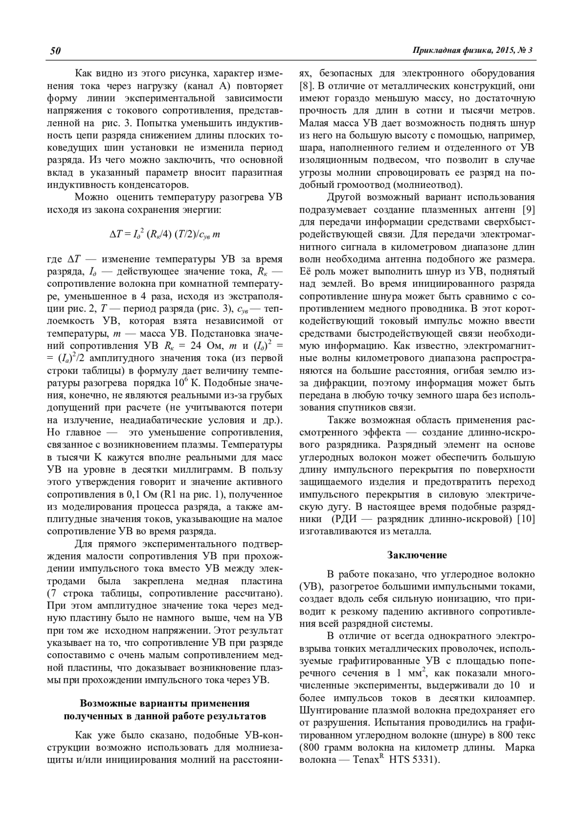 В отличие от всегда однократного электровзрыва тонких металлических проволочек, используемые графитированные УВ с площадью поперечного сечения в 1 мм2, как показали многочисленные эксперименты, выдерживали до 10 и более импульсов токов в десятки килоампер. Шунтирование плазмой волокна предохраняет его от разрушения. Испытания проводились на графитированном углеродном волокне (шнуре) в 800 текс (800 грамм волокна на километр длины. Марка волокна — TenaxR HTS 5331).