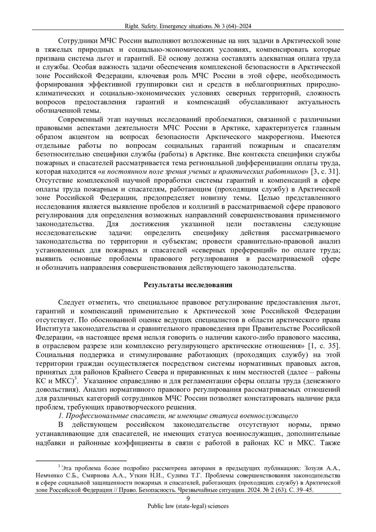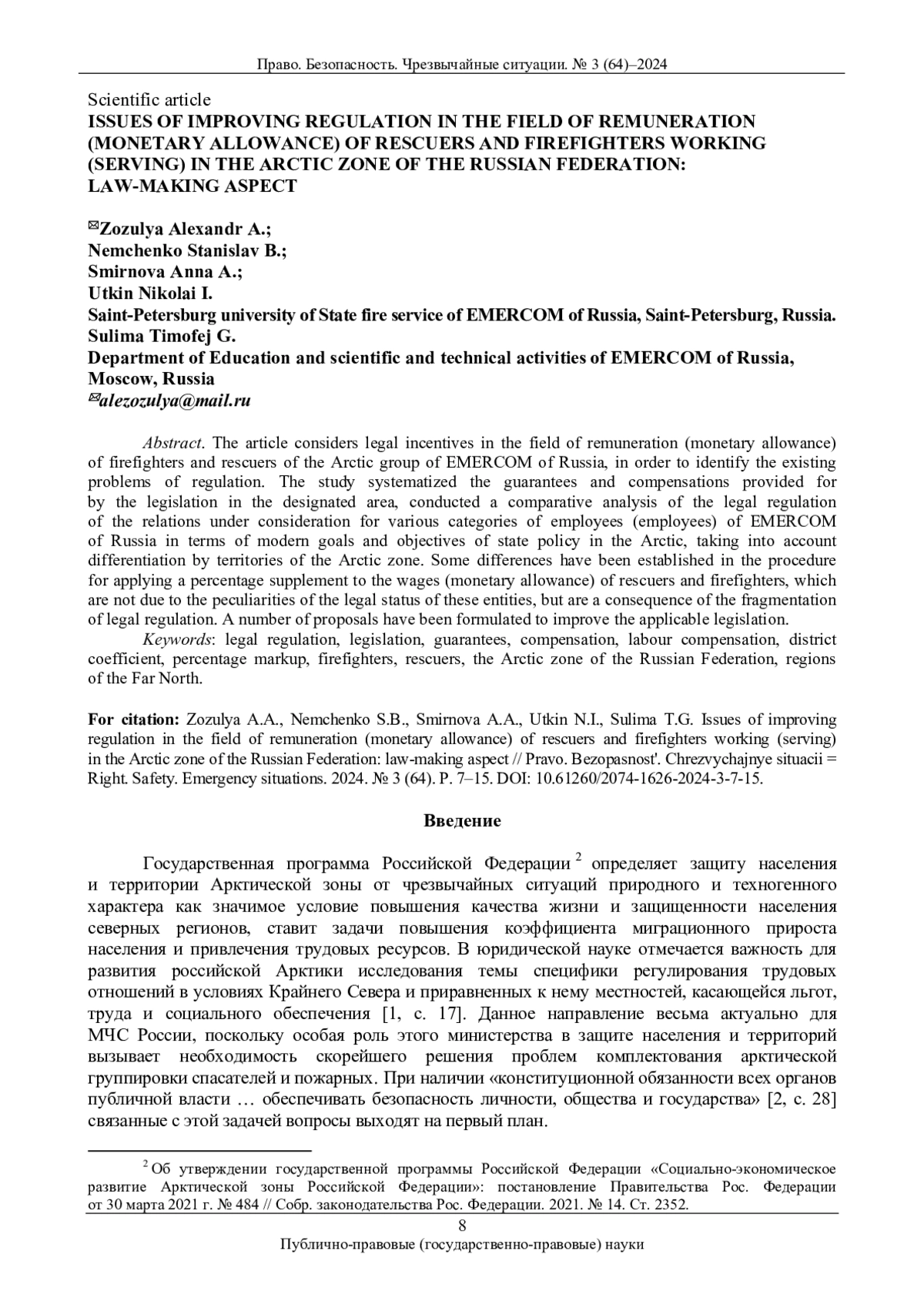 Рассматриваются правовые стимулы в сфере оплаты труда (денежного довольствия) пожарных и спасателей арктической группировки МЧС России с целью выявления имеющихся проблем нормативного регулирования. В исследовании систематизированы предусмотренные законодательством «северные» гарантии и компенсации в обозначенной сфере, проведен сравнительный анализ нормативного правового регулирования рассматриваемых отношений для различных категорий сотрудников (работников) МЧС России в аспекте современных целей и задач государственной политики в Арктике с учетом дифференциации по территориям Арктической зоны. Выявлены некоторые отличия в порядке применения процентной надбавки к заработной плате (денежному довольствию) спасателей и пожарных, которые не обусловлены особенностями правового статуса указанных субъектов, а являются следствием фрагментарности правового регулирования. Сформулирован ряд предложений по совершенствованию применимого законодательства.