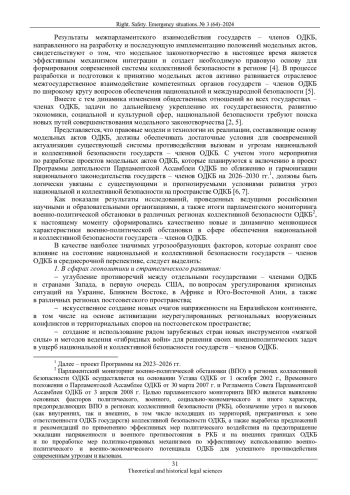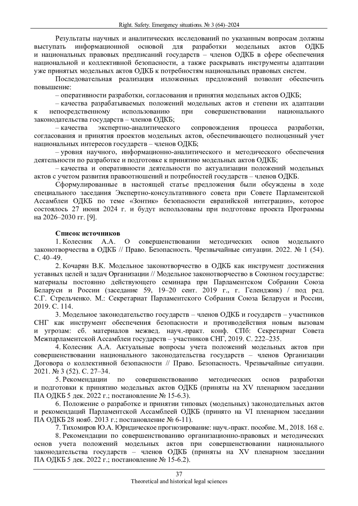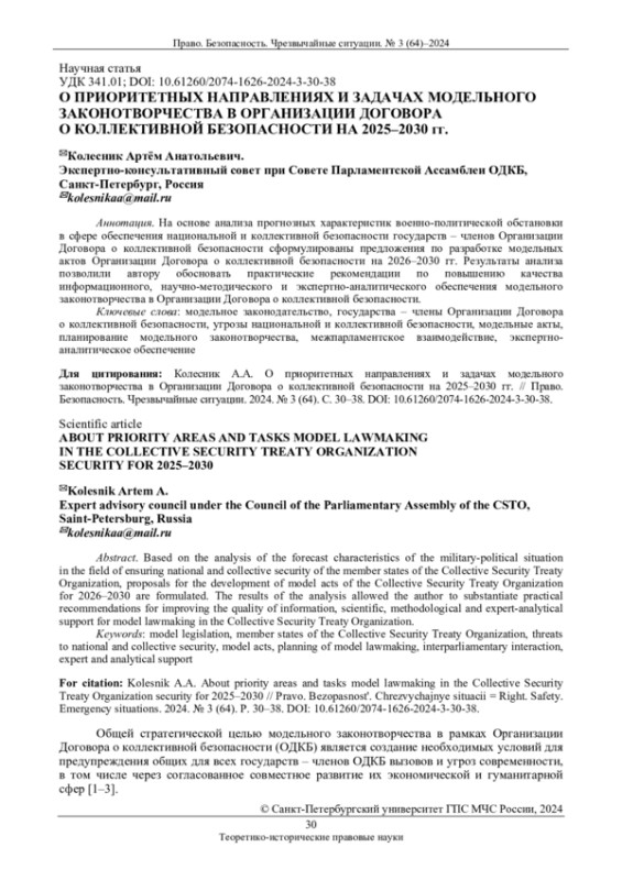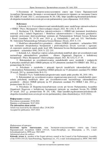 1. Колесник А.А. О совершенствовании методических основ модельного законотворчества в ОДКБ // Право. Безопасность. Чрезвычайные ситуации. 2022. № 1 (54). С. 40-49. EDN: ASQSJS