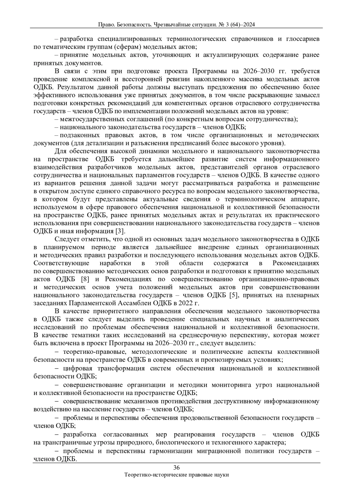 Представляется, что правовые модели и технологии их реализации, составляющие основу модельных актов ОДКБ, должны обеспечивать достаточные условия для своевременной актуализации существующей системы противодействия вызовам и угрозам национальной и коллективной безопасности государств – членов ОДКБ. С учетом этого мероприятия по разработке проектов модельных актов ОДКБ, которые планируются к включению в проект Программы деятельности Парламентской Ассамблеи ОДКБ по сближению и гармонизации национального законодательства государств – членов ОДКБ на 2026–2030 гг. 1, должны быть логически увязаны с существующими и прогнозируемыми условиями развития угроз национальной и коллективной безопасности на пространстве ОДКБ [6, 7].