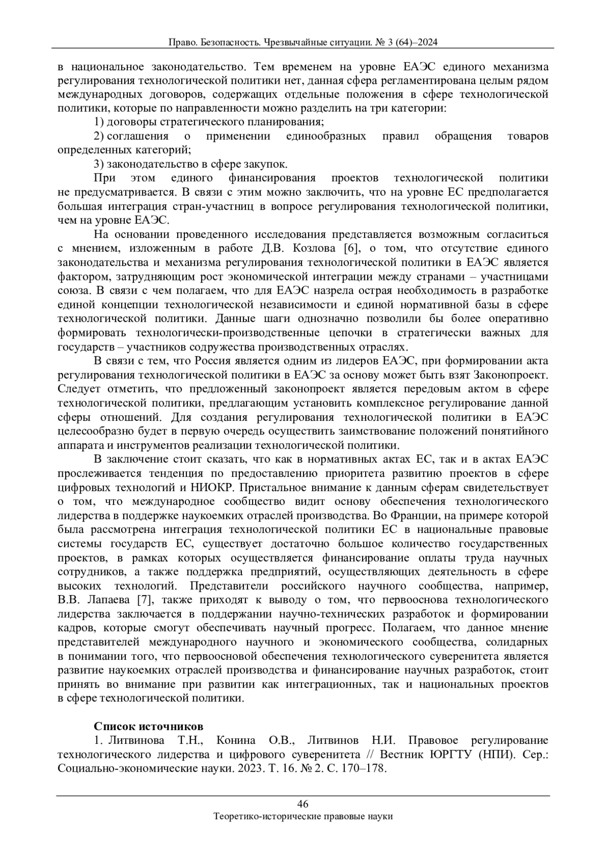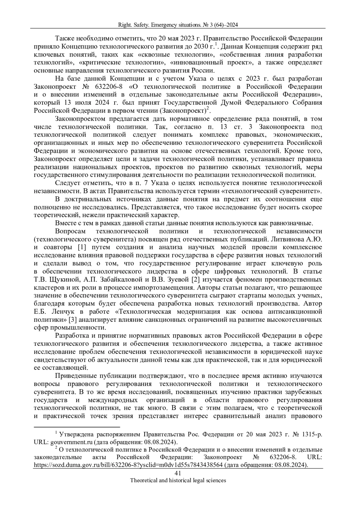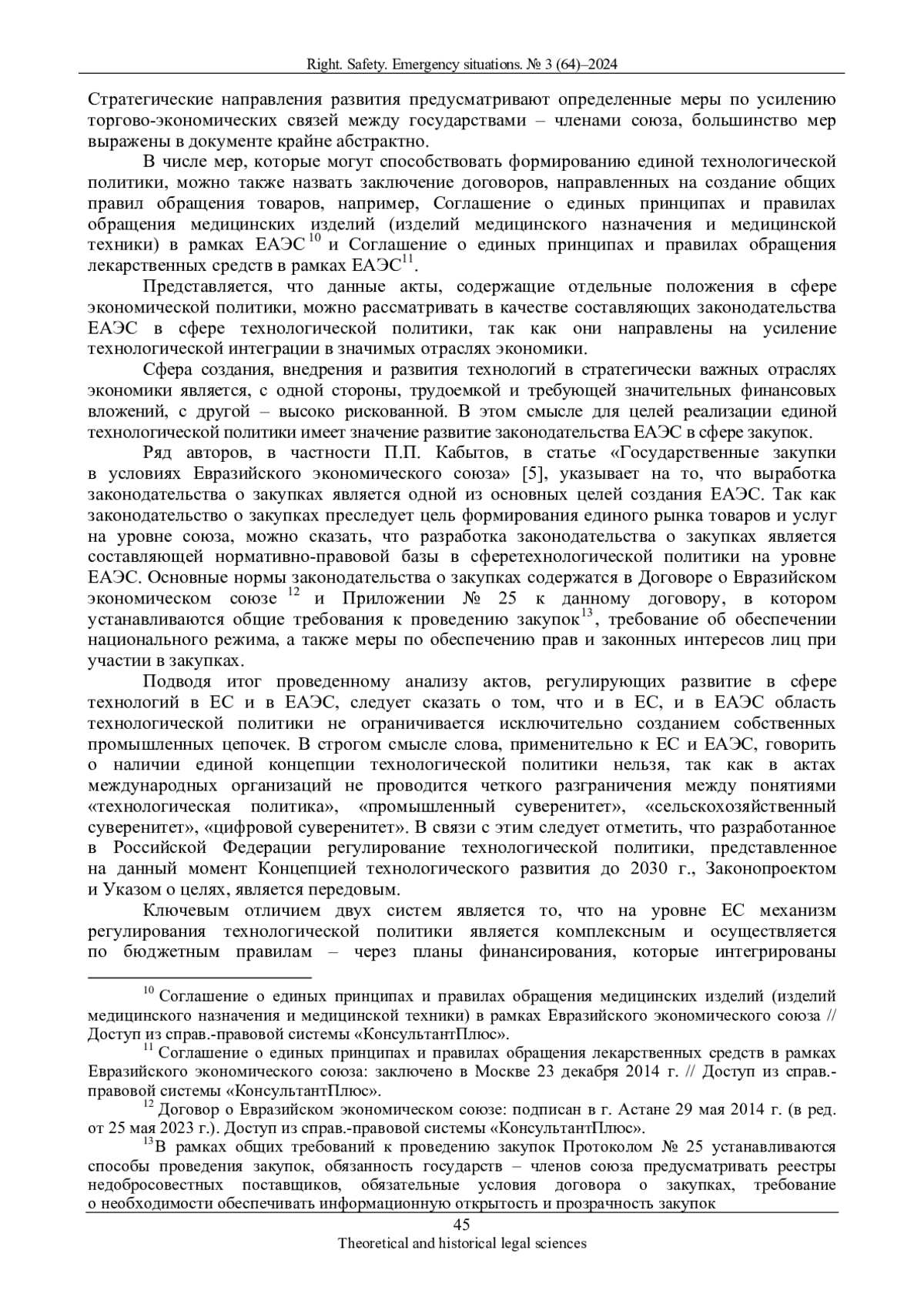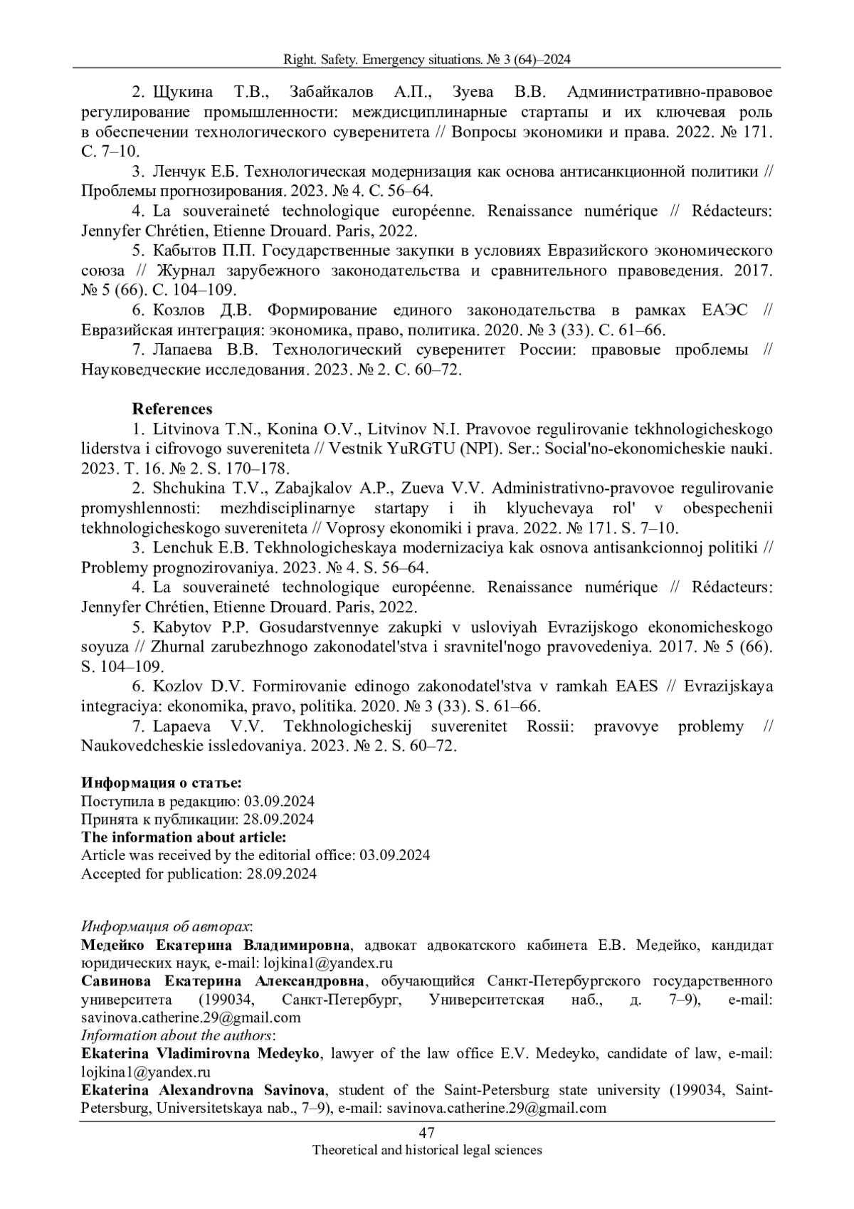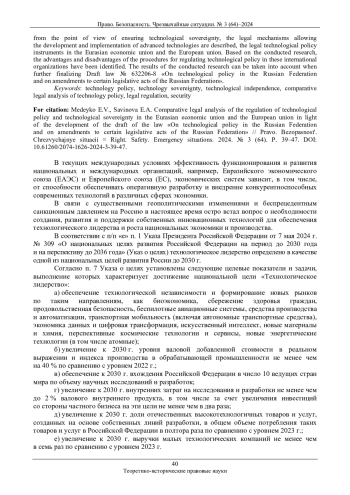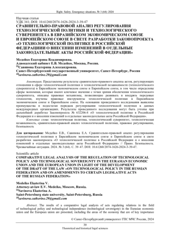 Представлены результаты сравнительно-правового анализа актов, регулирующих отношения в сфере технологической политики и технологической независимости (технологического суверенитета) в Евразийском экономическом союзе и Европейском союзе, в том числе определены сферы экономики, которые имеют ключевое значение с точки зрения обеспечения технологического суверенитета, описаны правовые механизмы, позволяющие развивать и внедрять передовые технологии, изучены правовые инструменты технологической политики в Евразийском экономическом союзе и Европейском союзе. На основании проведенного исследования выявлены преимущества и недостатки порядков регулирования технологической политики в данных международных организациях. Результаты проведенного исследования могут быть учтены при дальнейшей доработке Законопроекта № 632206-8 «О технологической политике в Российской Федерации и о внесении изменений в отдельные законодательные акты Российской Федерации».